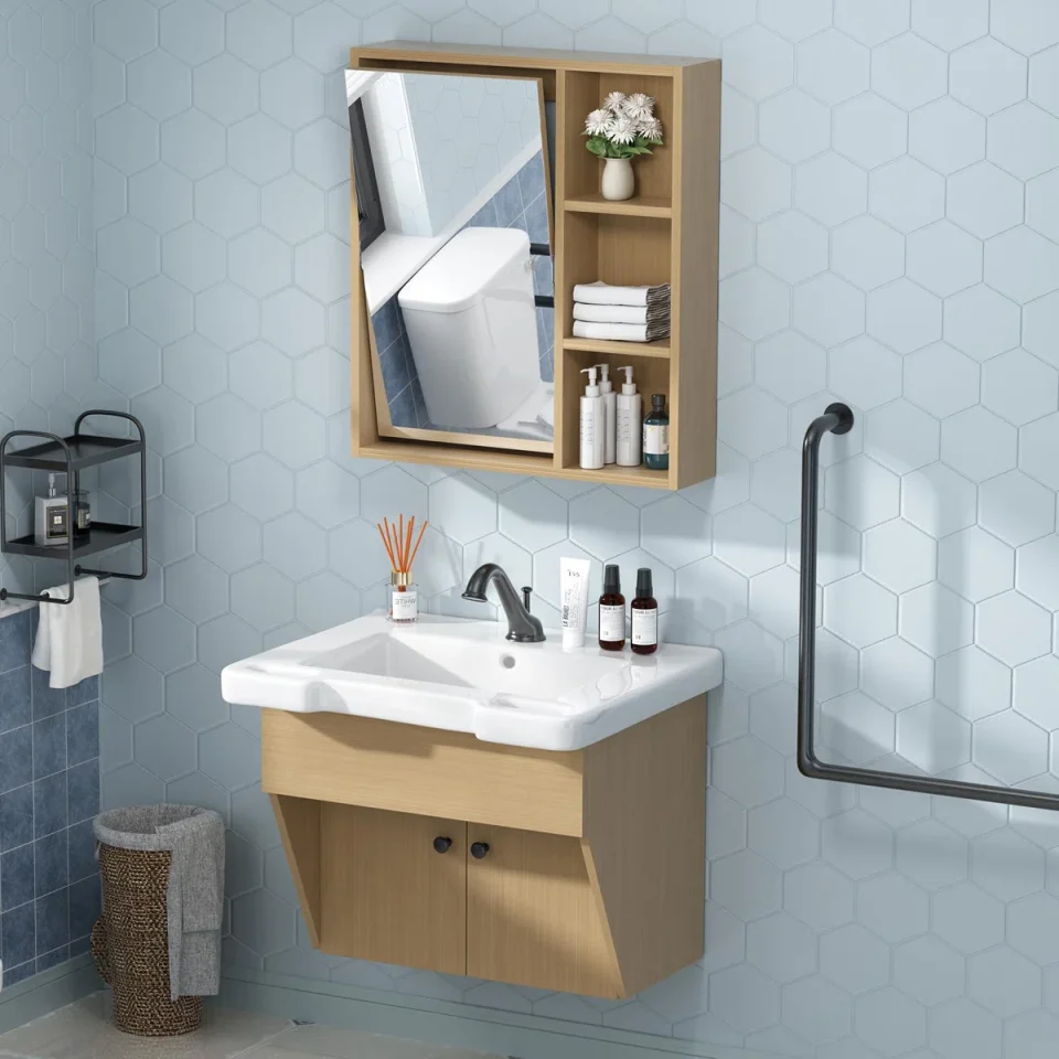 The 24" ADA Wall Mounted Single Bathroom Vanity with Ceramic Top & Mirror Cabinet is designed for accessibility and style. Its curved contour allows wheelchair access, and the sink offers easy grip recesses. Compact yet durable, this 24" vanity with top resists moisture, mold, and cracking. The adjustable mirror cabinet and sleek single sink design make it perfect for small spaces, combining functionality and elegance in a 24" bathroom vanity with sink.