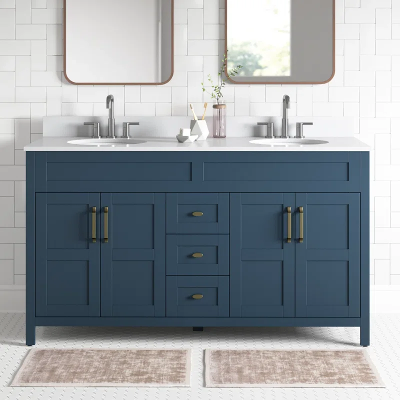 This freestanding double vanity gives you a spacious spot in your bathroom to get ready for the day. It has a crisp, modern silhouette and a clean-lined base crafted from engineered wood. Three central drawers and two cabinets, each with a set of double doors, provide ample room for towels and toiletries. The white stone countertop measures 59.5" wide and includes two oval undermount sinks, and faucets sold separately. Bonus: This vanity arrives fully assembled with two openings in the back for hassle-free installation.