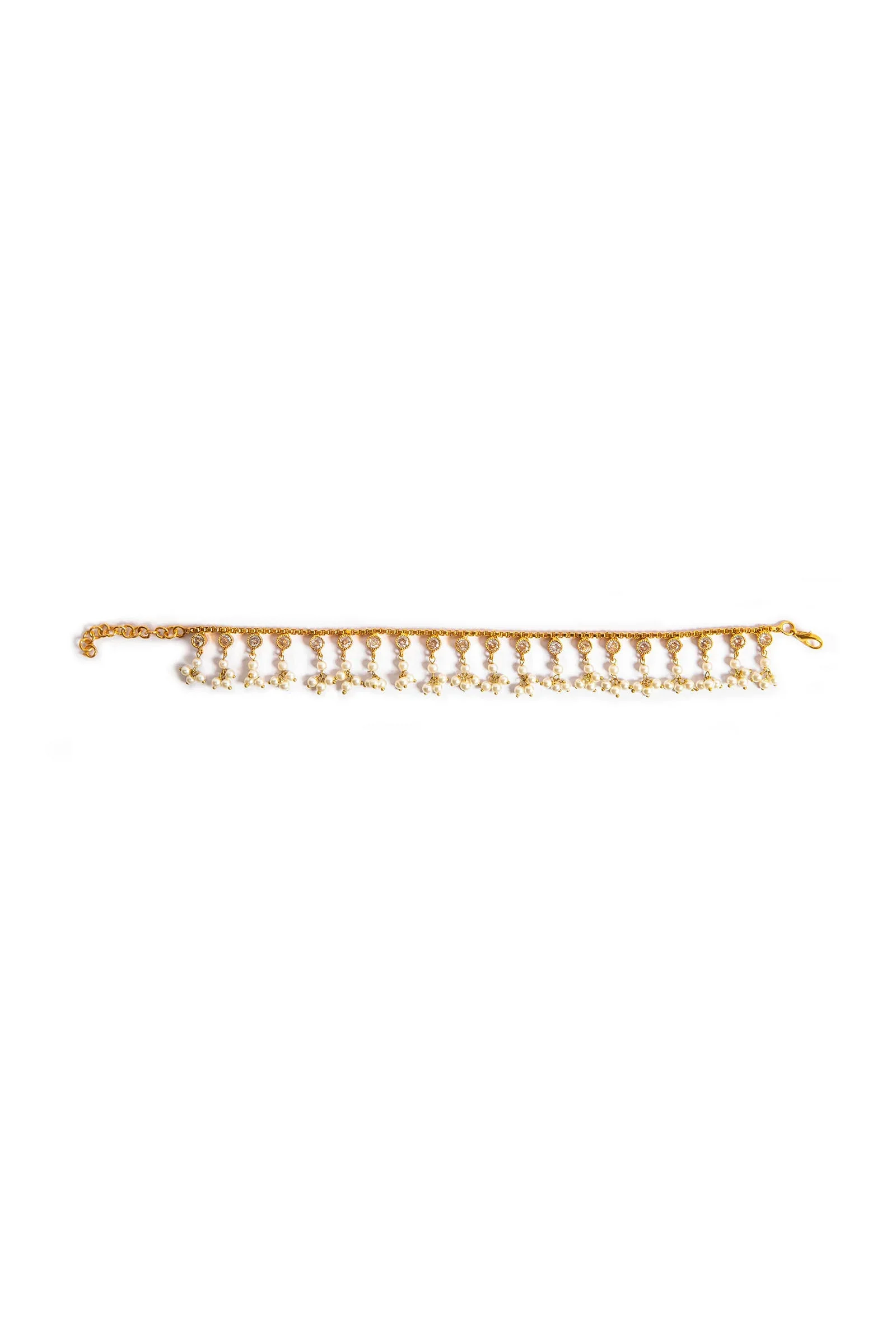A gorgeous adjustable anklet in the metal chain with round dull gold glass cut escorted by pearl pyroi with each round zircon will complete your wedding look.