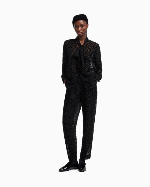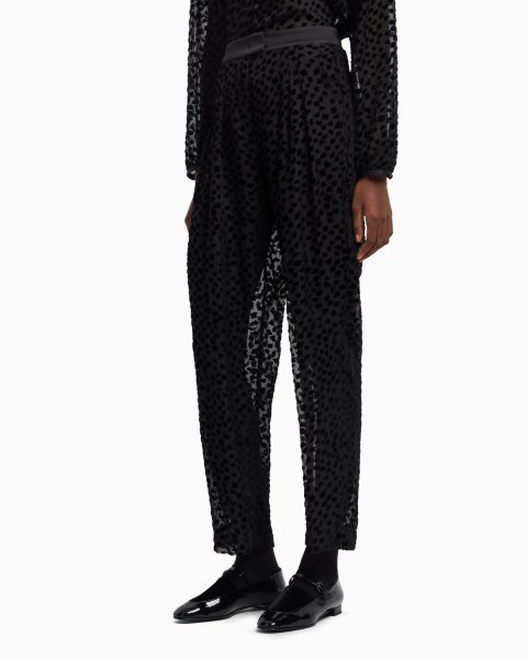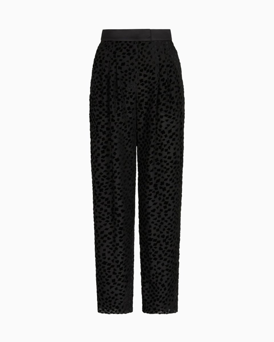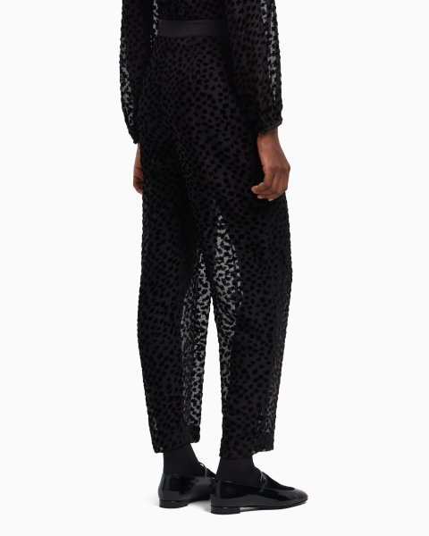 Trousers with pleats at the waist, made from tulle with the collection’s pattern in devoré velvet. The intriguing world of playing cards is the theme running through this season’s women’s collection. The Jeu de Cartes theme is playfully interpreted in different details of the collection: the elegance and refinement of Emporio Armani intertwine with the classic symbols of the playing-card suits, to create looks with a mysterious and sophisticated allure.