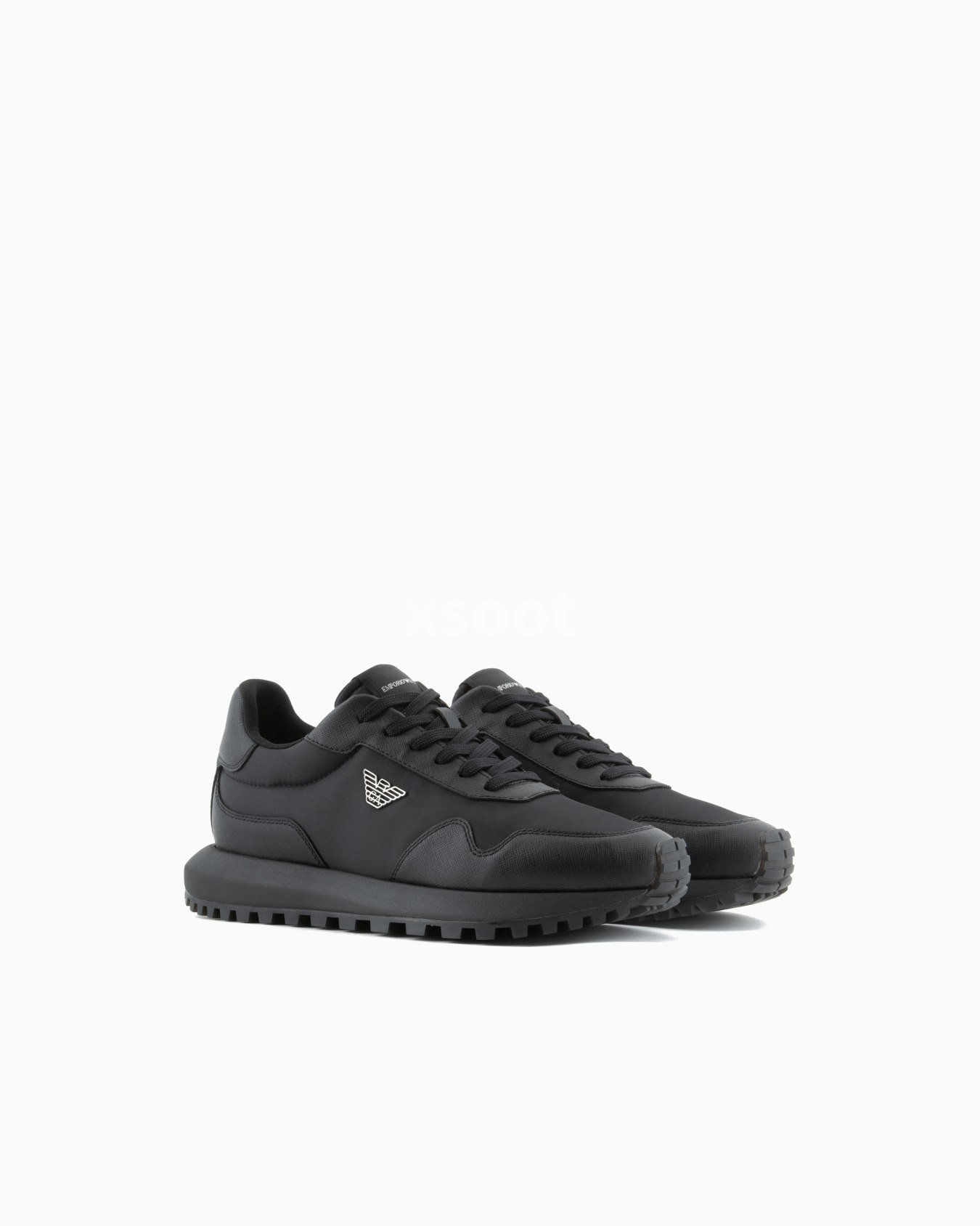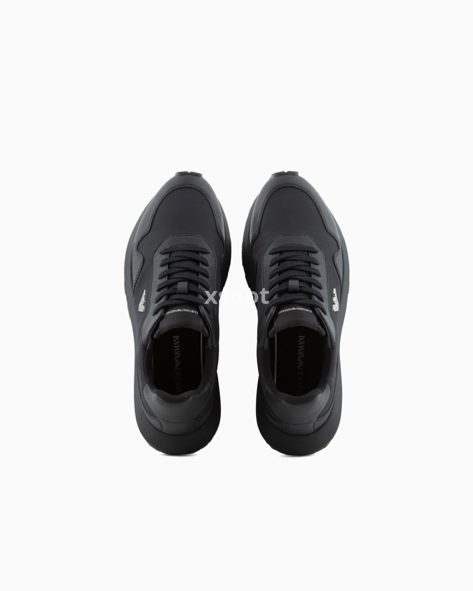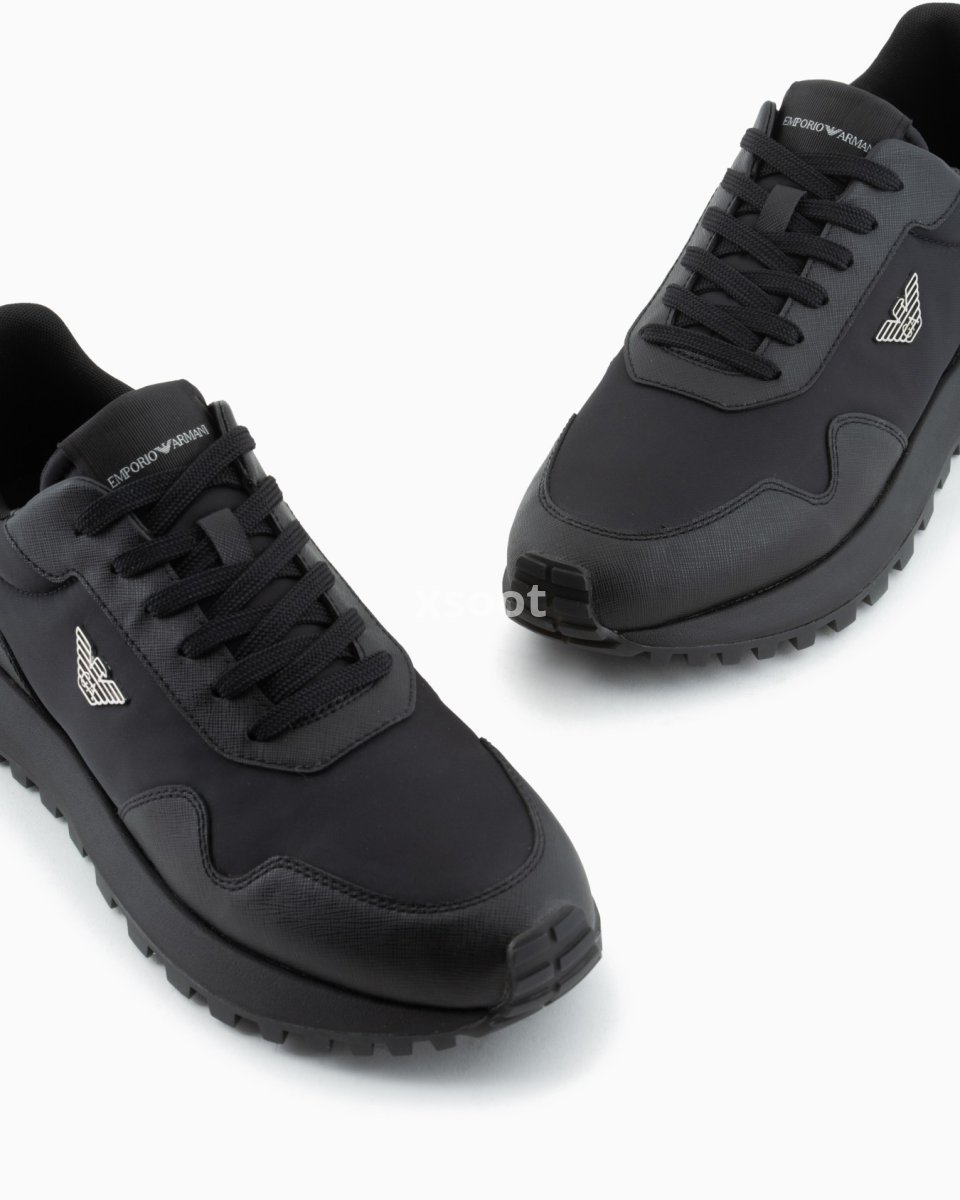 Sneakers made from recycled nylon with regenerated leather details and exclusive Saffiano embossing. The moulded metal plaque on the iconic eagle fixed on the side distinguishes the style.