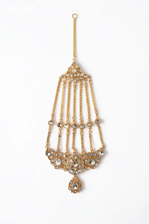 Adorned with handcut glass stones with white zircons, our Aurangabadi Bridal Jhoomar is delicate yet effortlessly chic, perfect for elevating your bridal look.