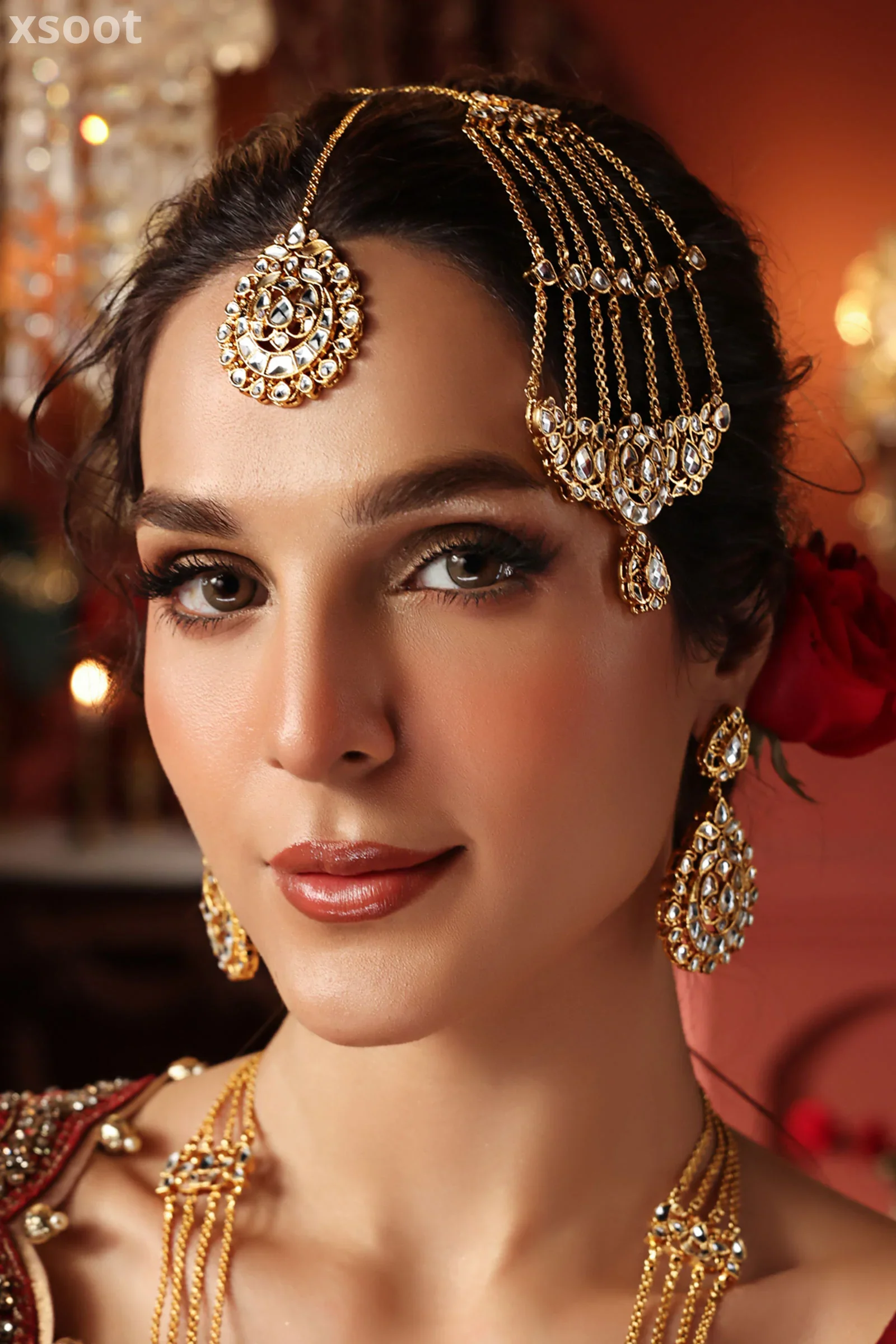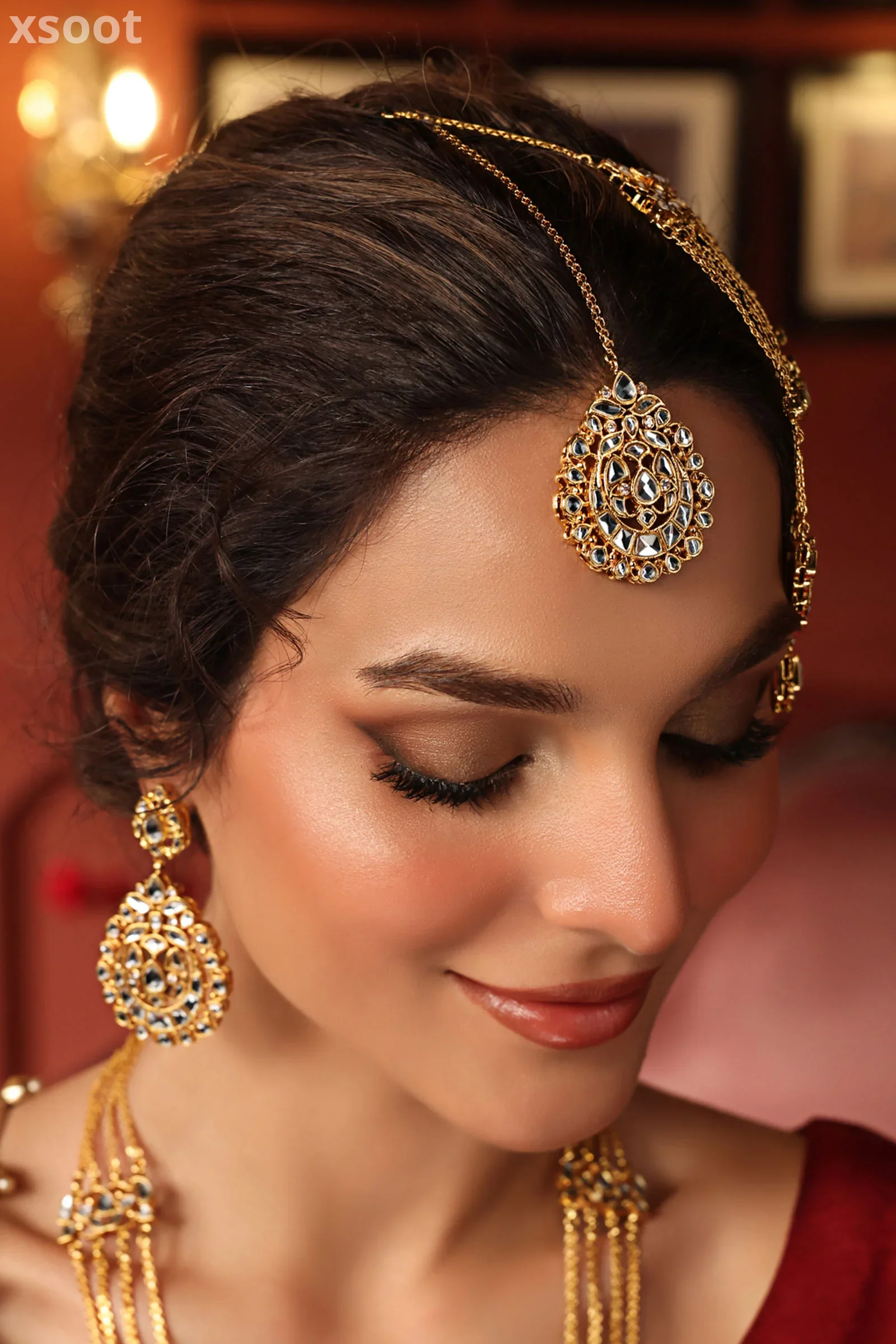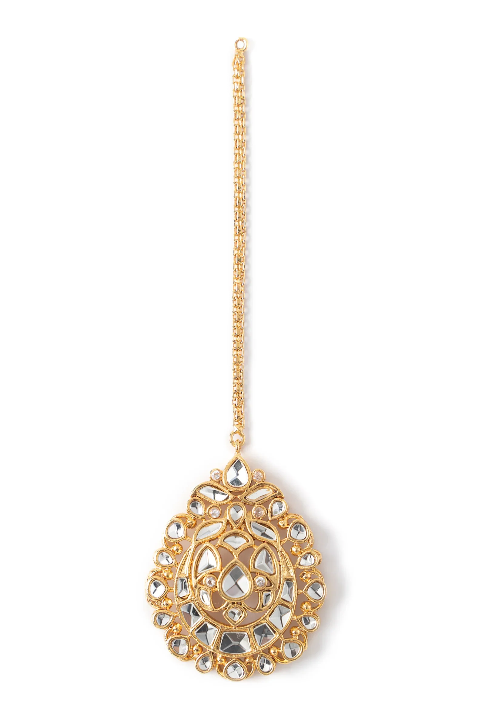Dramatizing the bridal elegance with our Aurangabadi Tikka, studded with handcut glass stones and white zircons for an added regal touch.
