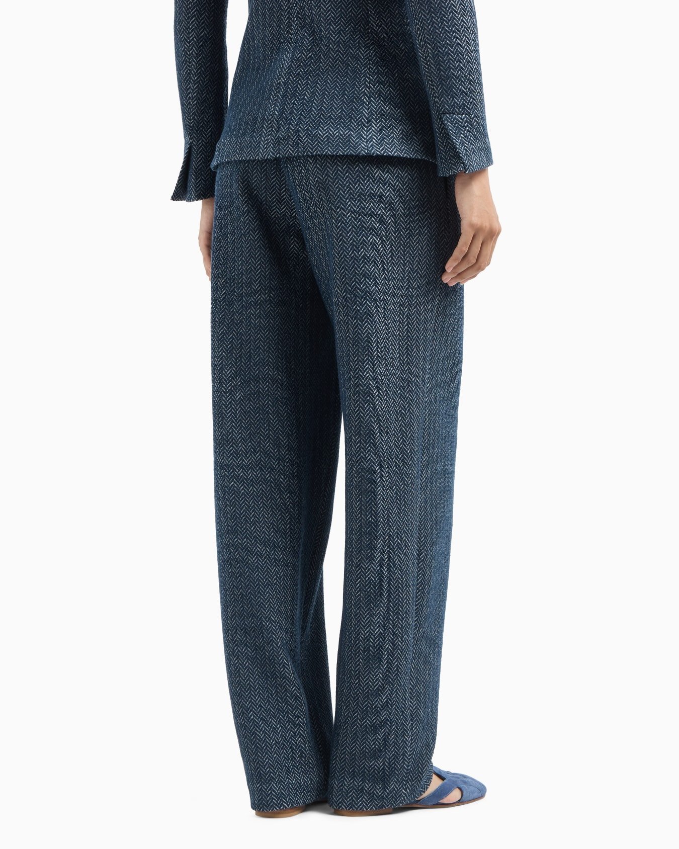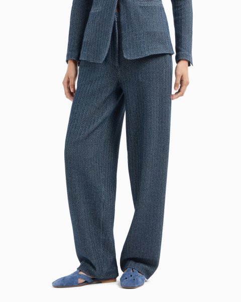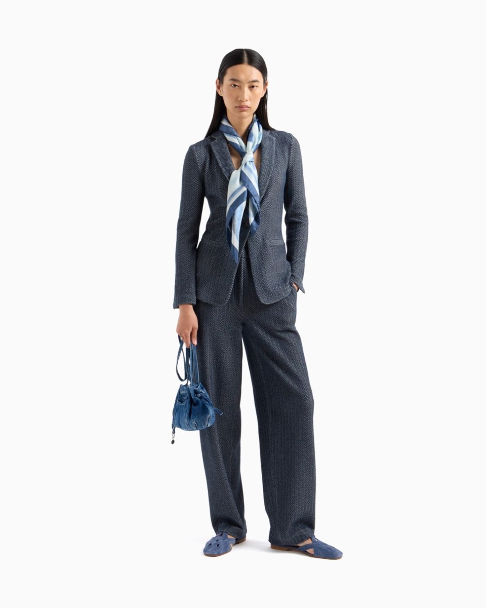Trousers made of jersey with the brand’s signature chevron motif, which takes on a sophisticated all-over two-tone look enhancing the style’s exclusive allure. A comfortable fit that, combined with the jacket in the same texture, creates a perfect total look with a modern feel.