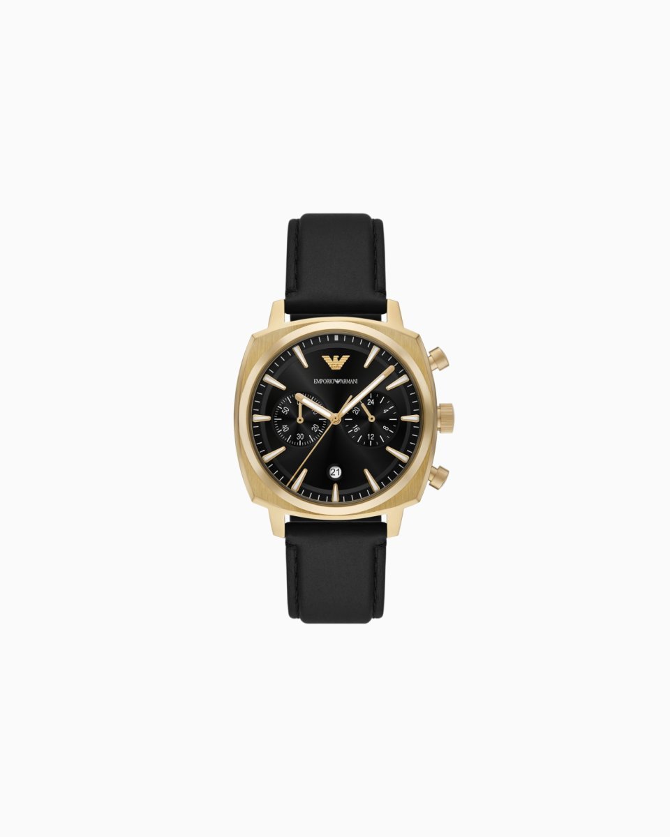 A 40mm, cushion-shaped case frames the black sunray dial of this watch with a quartz chronograph movement. Complemented by a pale gold tone stainless steel case with a date window at 6 o'clock and a black leather strap, this watch is the perfect contemporary execution of vintage flair.