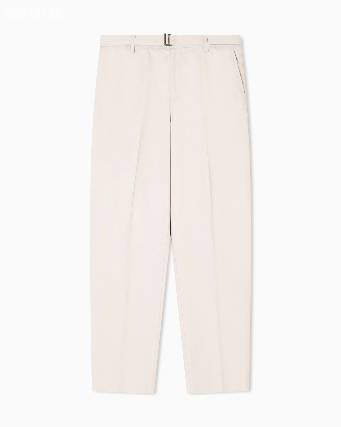 Trousers with a matching belt at the waist. The garment’s fabric, made from a cotton blend with a small percentage of silk, is particularly thick and resistant to the touch.
