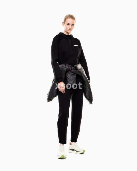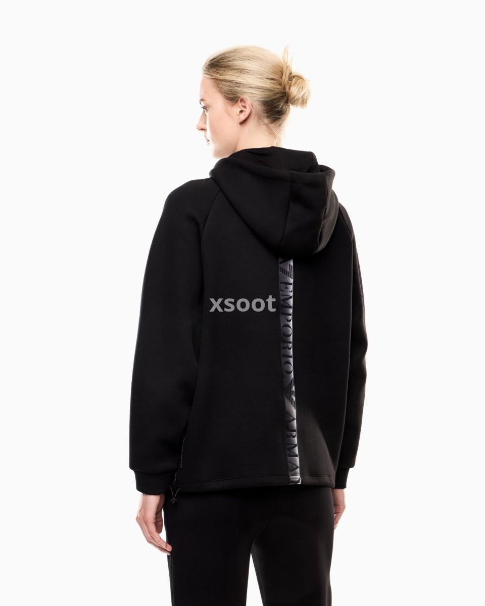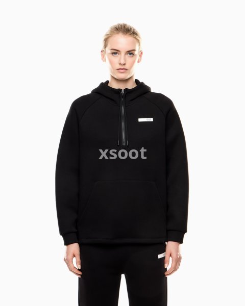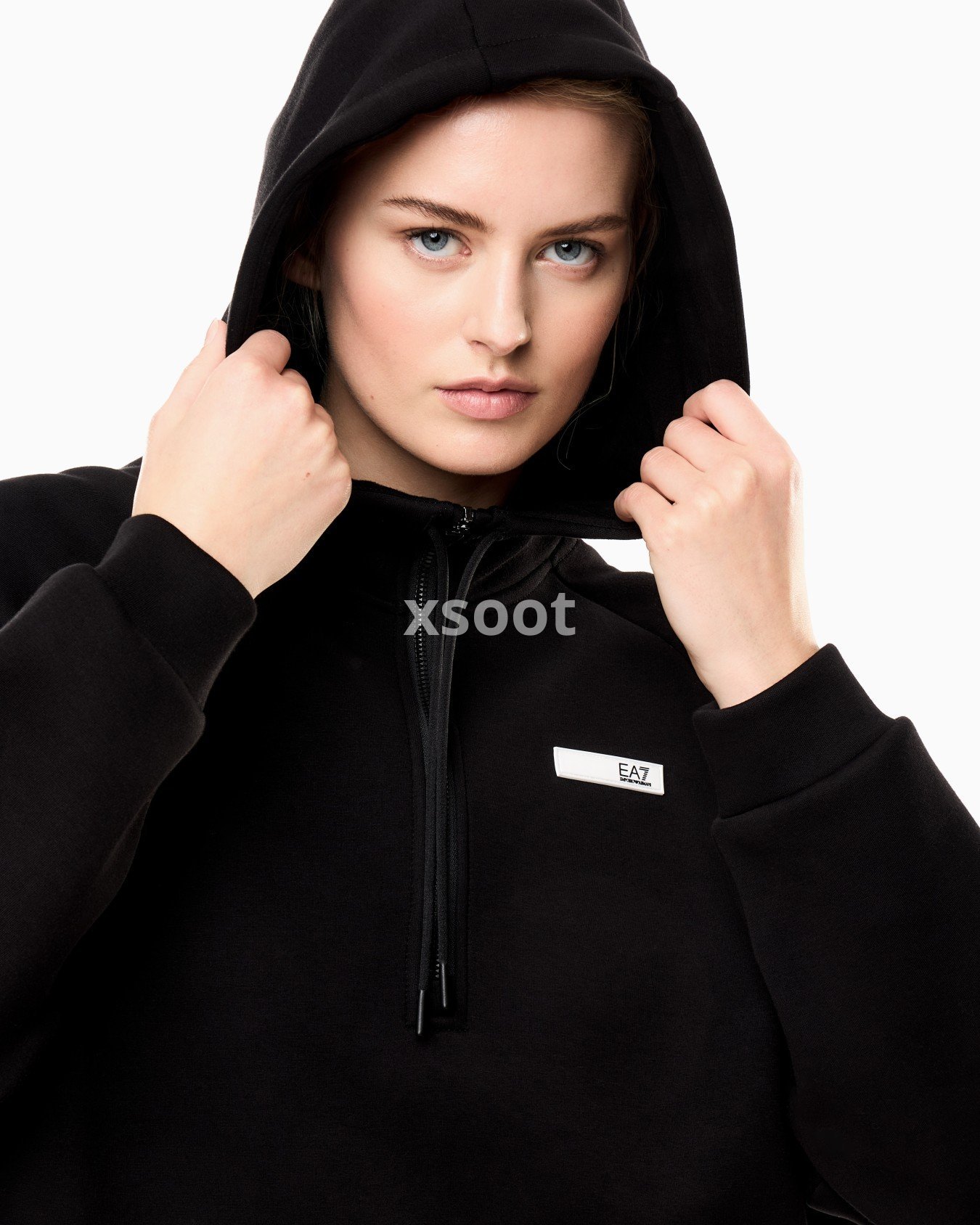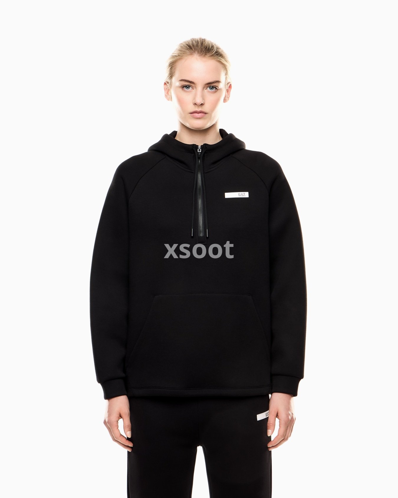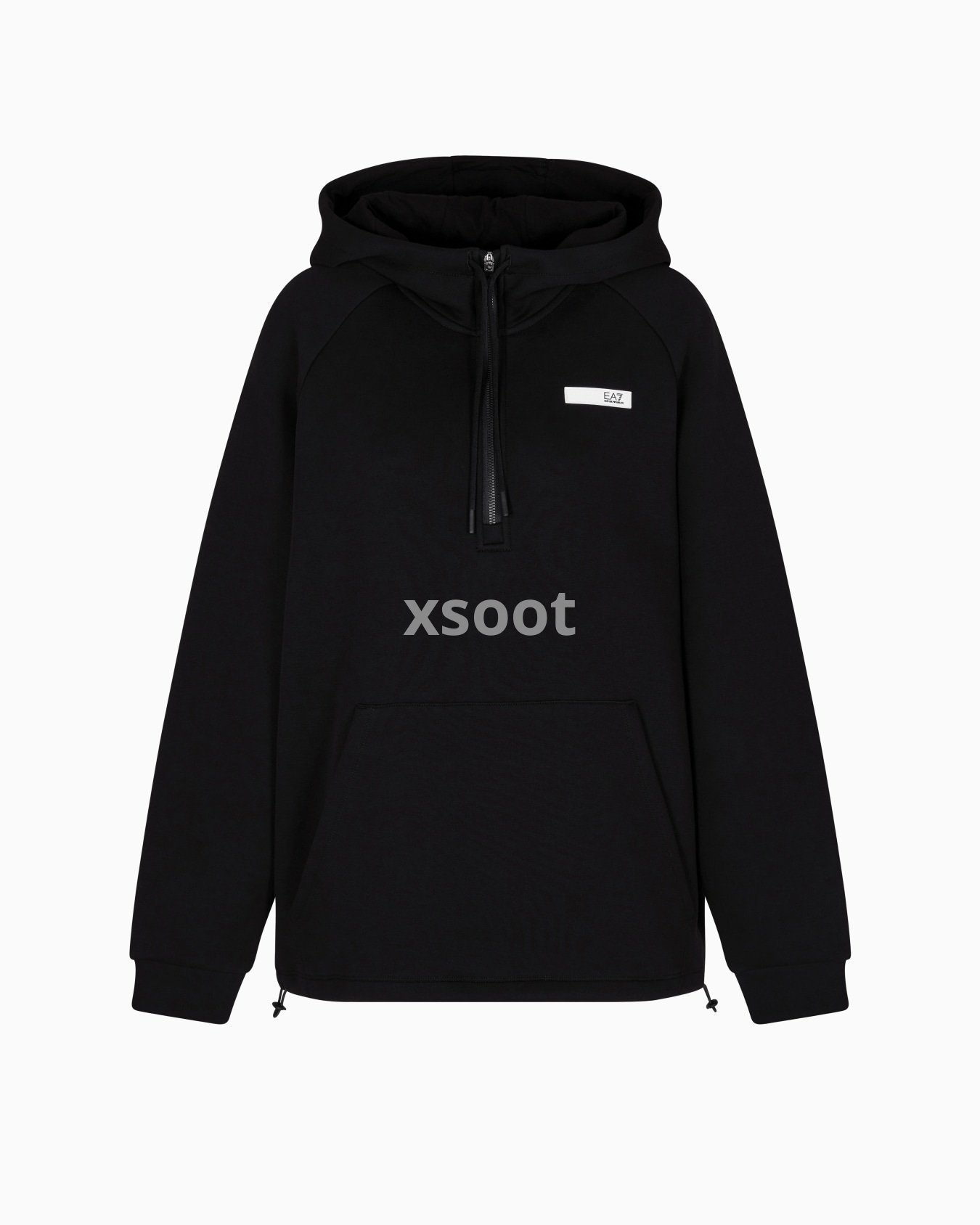 Comfortable sweatshirt with drawstring hood and three-quarter zip fastening, customised with a contrasting logo patch on the chest. This style features a logo tape detail on the back and is made of innovative Natural VENTUS7, a technical fabric composed of a mixture of natural and synthetic fibres that regulates body temperature by dissipating sweat as water vapour, while cotton fibres ensure a high level of comfort.