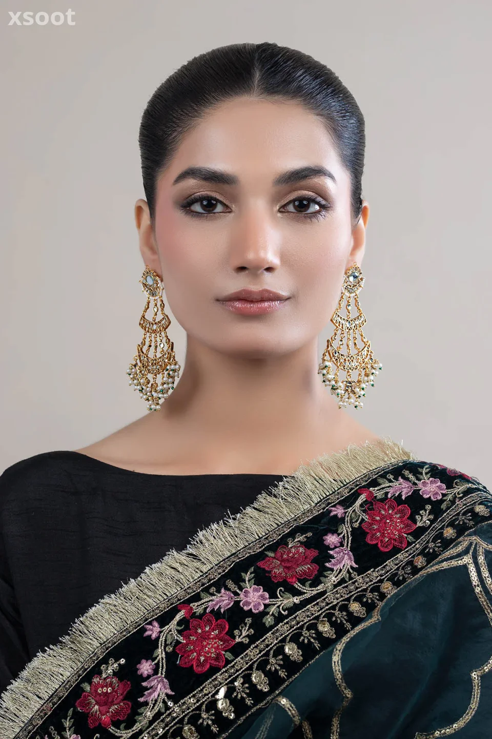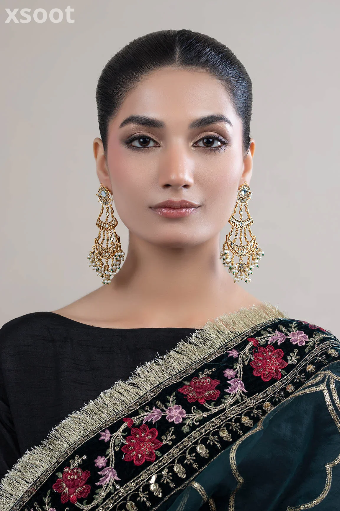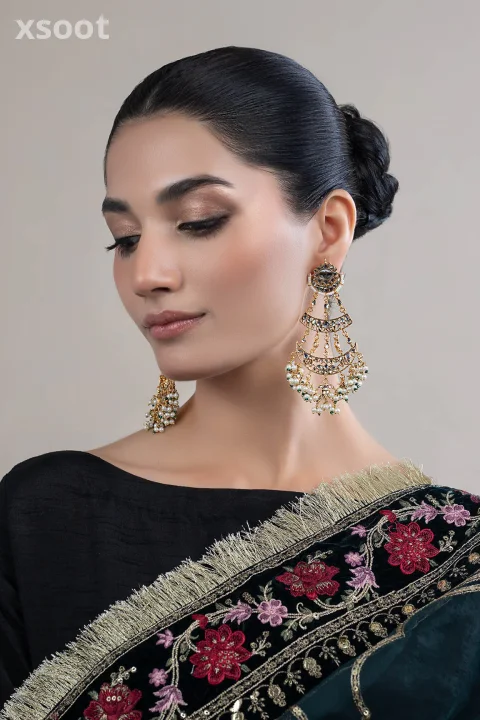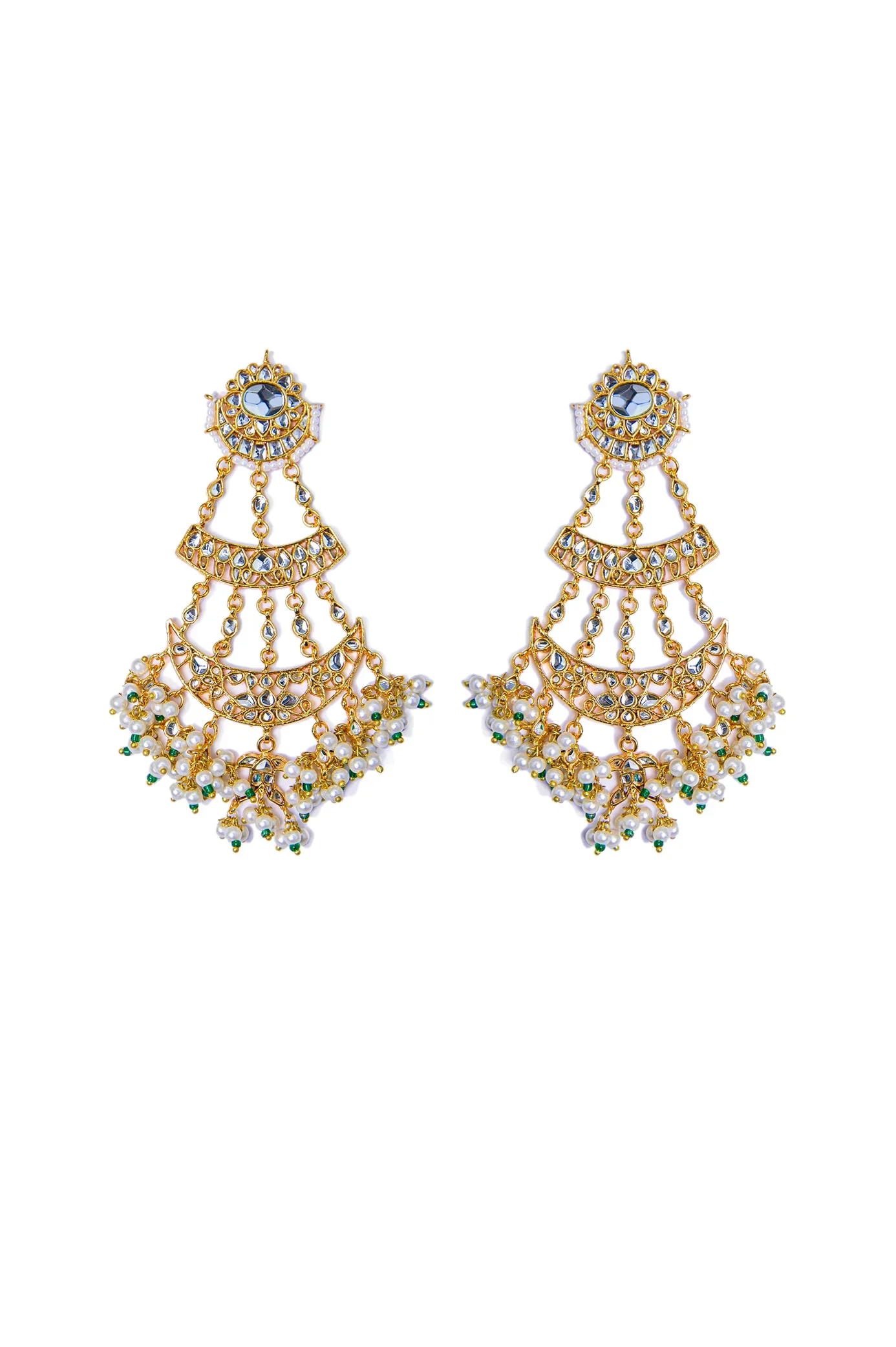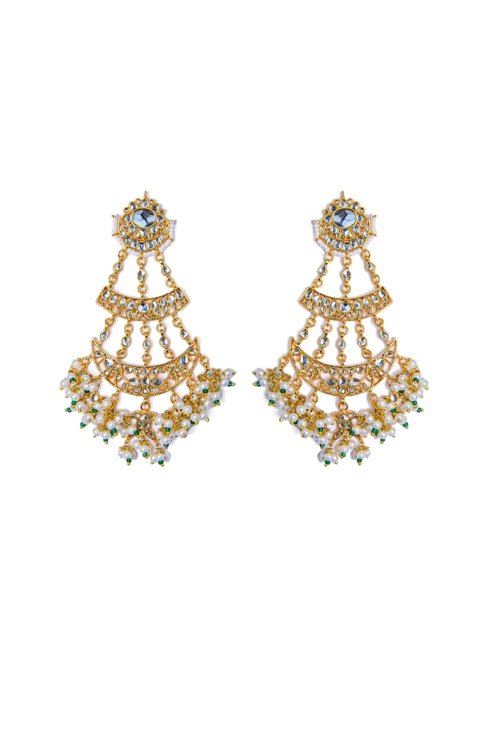Exude regal elegance with our chand motif hyderabadi earrings, crafting tradition with hand-cut glass stones complemented with intricate hanging pearl pyori complemented with a tint of green poth. Expertly plated in a stunning 21K gold finish, this statement piece adds a royal touch to your overall look.