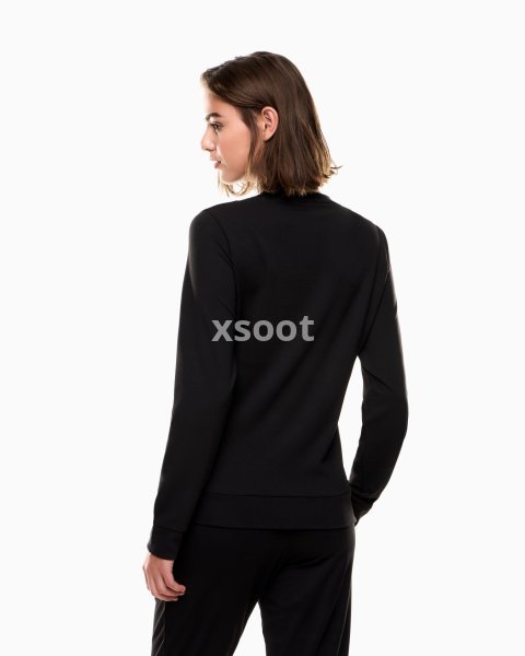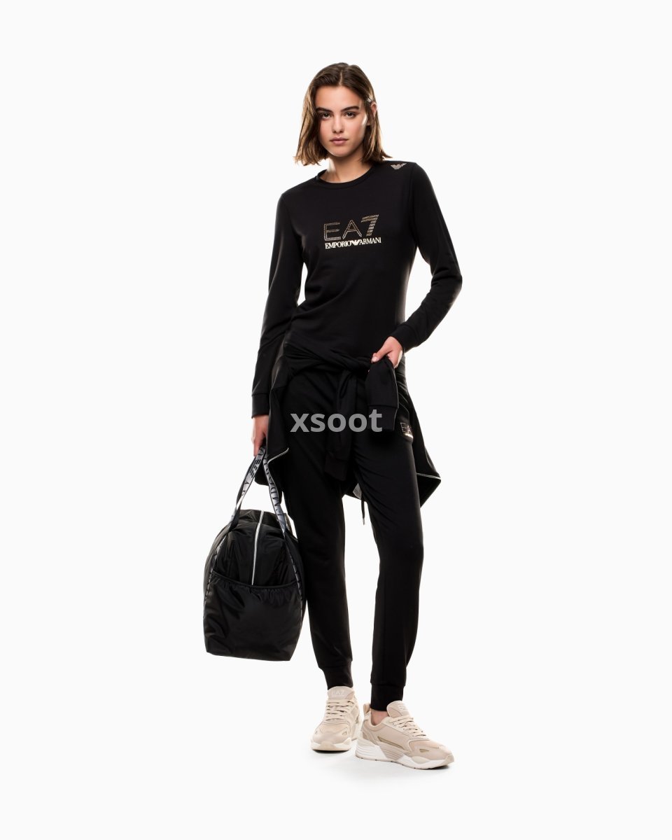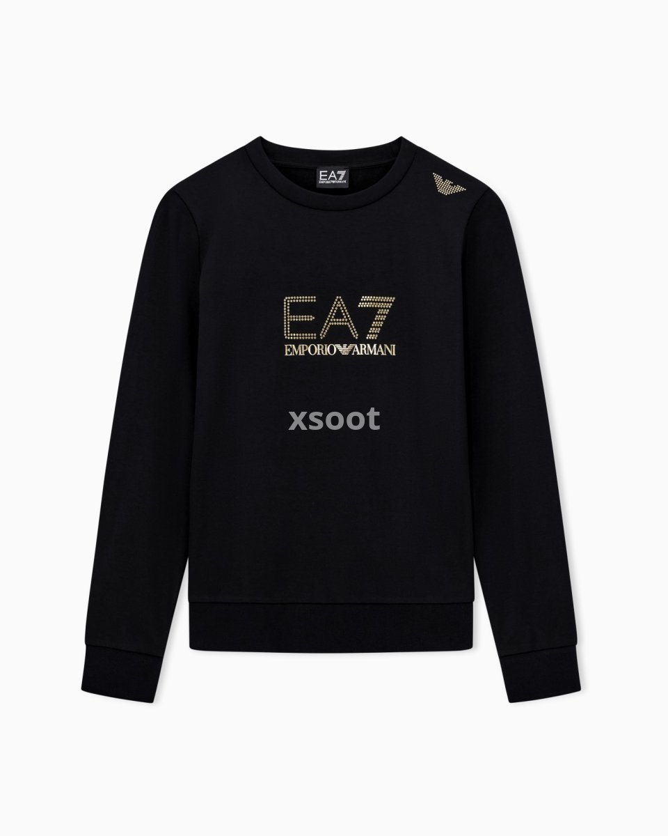A versatile, comfortable, regular-fit stretch viscose blend crew-neck sweatshirt designed for leisure time and sports. A style that stands out with the customisation of the EA7 logo on the chest and the Eagle logo on the shoulder both made of gold micro studs that add a shiny touch and recall both the trousers and T-shirts of the same line.