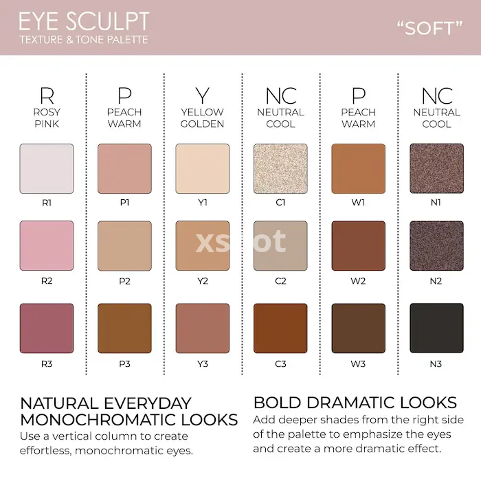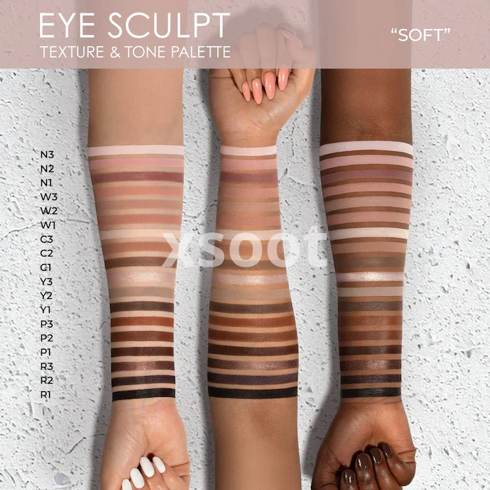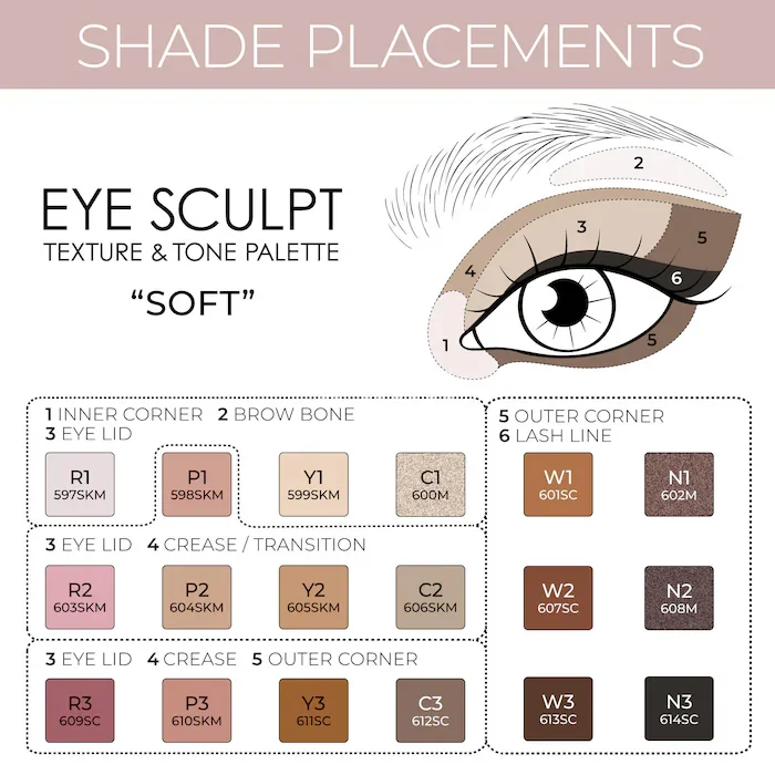 18 x 0.04 oz / 1.18 g Eyeshadows in R1 597SKM (Matte Light Pastel Rose), P1 598SKM (Matte Light Medium Nude), Y1 599SKM (Matte Light Vanilla), C1 600M (Metallic Light Icy Pearl), W1 601SC (Cream Matte Medium Warm Nude), N1 602M (Metallic Dark Neutral Brown), R2 603SKM (Matte Dusty Rose), P2 604SKM (Matte Medium Peach Nude), Y2 605SKM (Matte Light Medium Dusty Sand), C2 606SKM (Matte Light Medium Cool Nude), W2 607SC (Cream Matte Medium Dark Brown), N2 608M (Metallic Satin Deep Brown), R3 609SC (Cream Matte Vintage Rose), P3 610SKM (Matte Medium Dusty Peach Nude), Y3 611SC (Cream Matte Medium Earthy Brown), C3 612SC (Cream Matte Medium Cool Brown), W3 613SC (Cream Matte Coffee Bean Brown), N3 614SC (Cream Matte Intense Black)