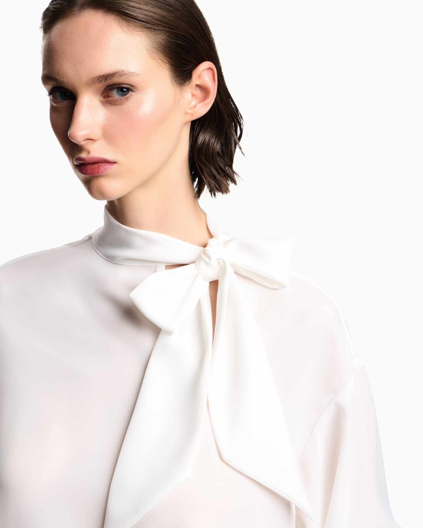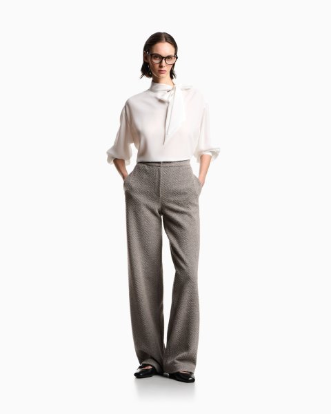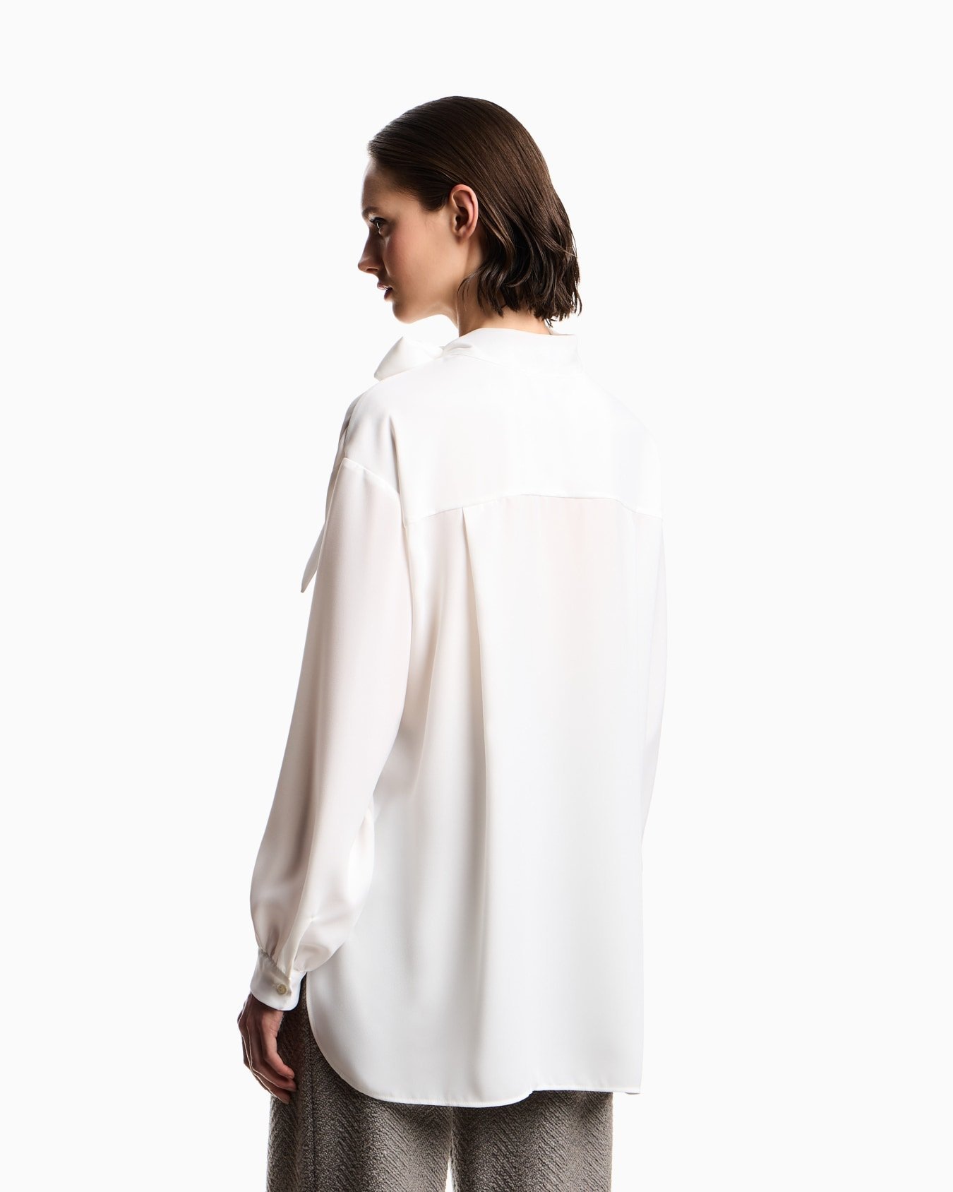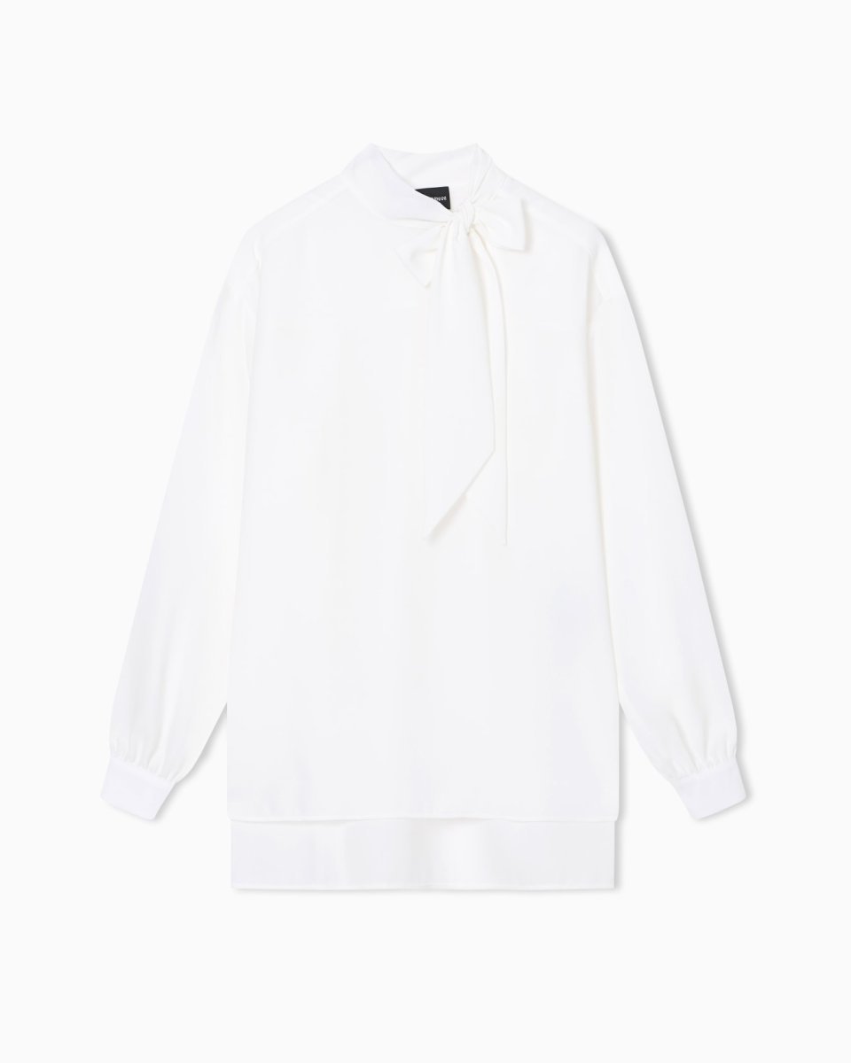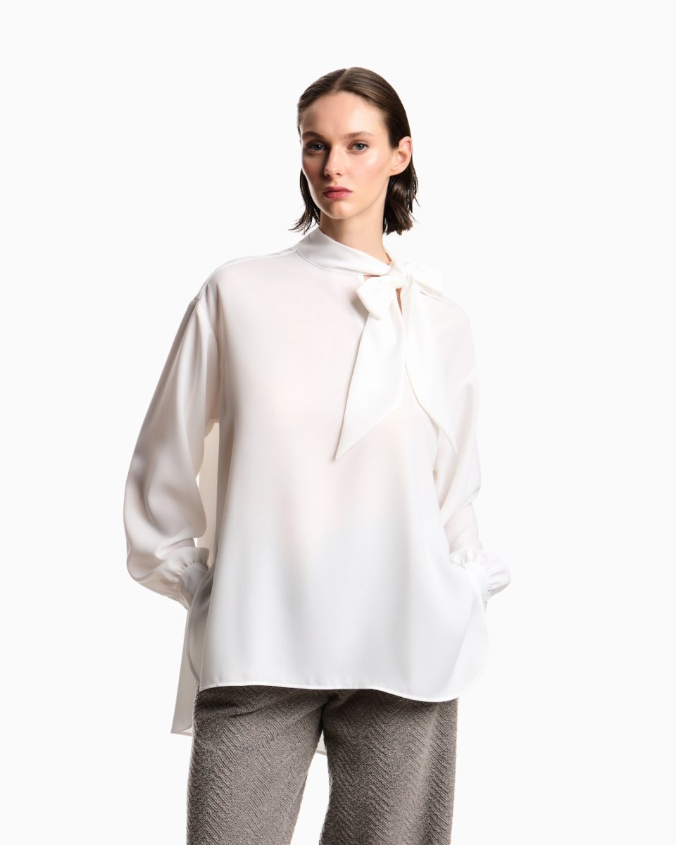 Blouse with flared hem made of fluid crêpe that takes on an ultra feminine style that will add an elegant touch to any outfit. The distinctiveness of the piece comes from the foulard collar with flaps that can be knotted to create a sophisticated decorative bow at the front.