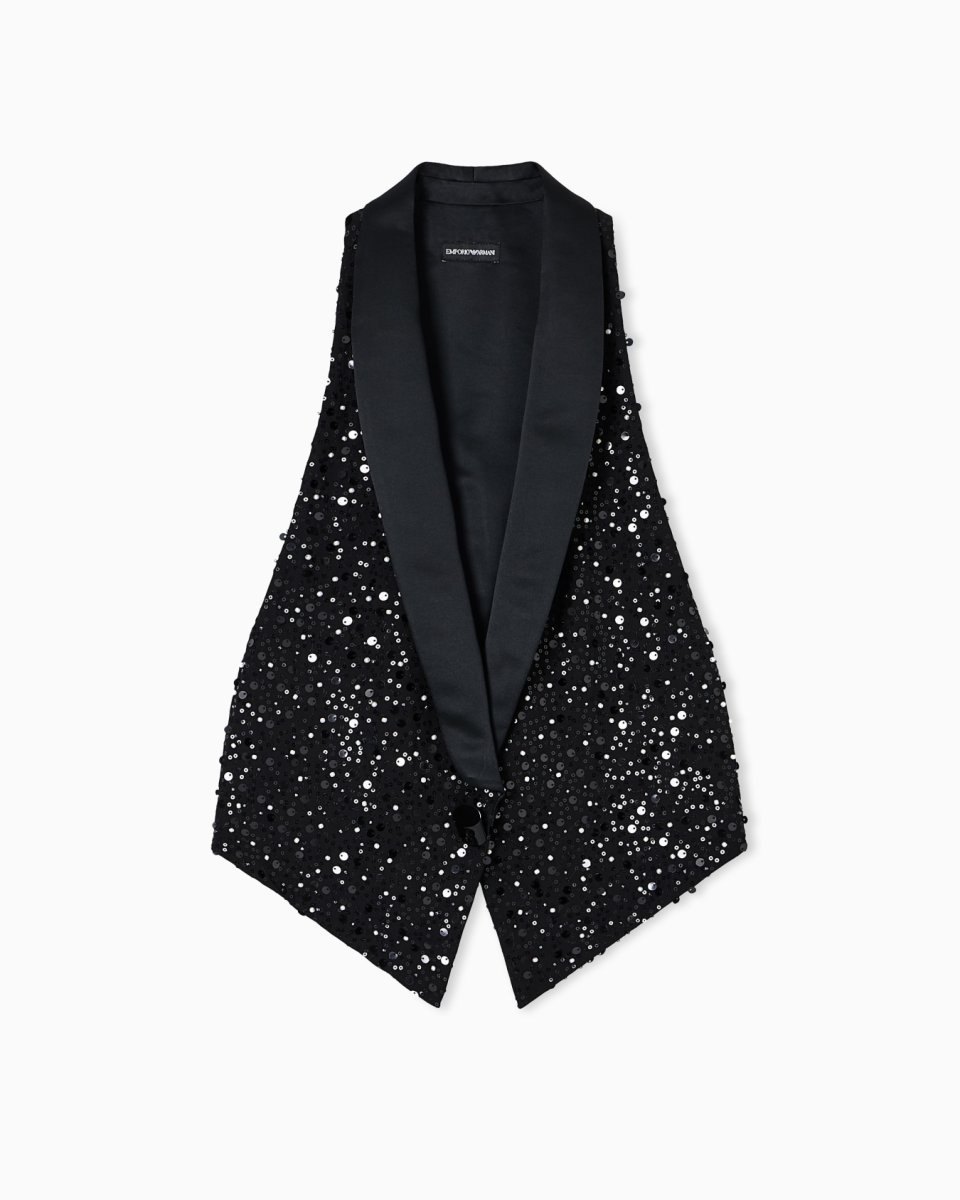 Georgette waistcoat with shawl lapels that create a wide V neckline and a one-button closure. The style is embellished with all-over beads and sequins adding a bright, sophisticated touch.