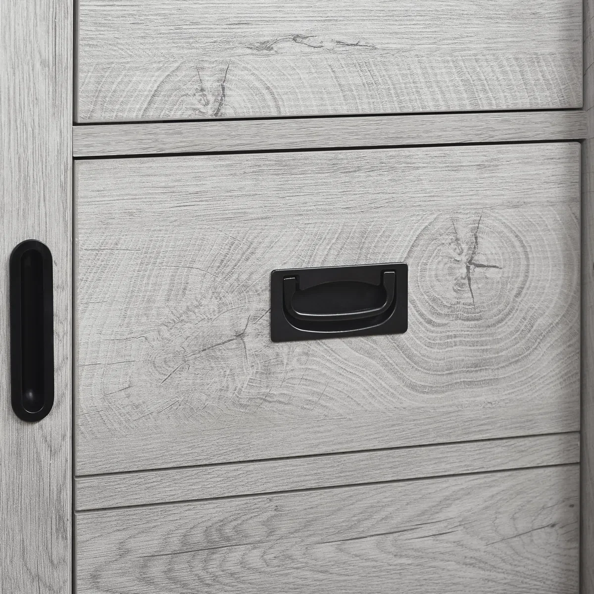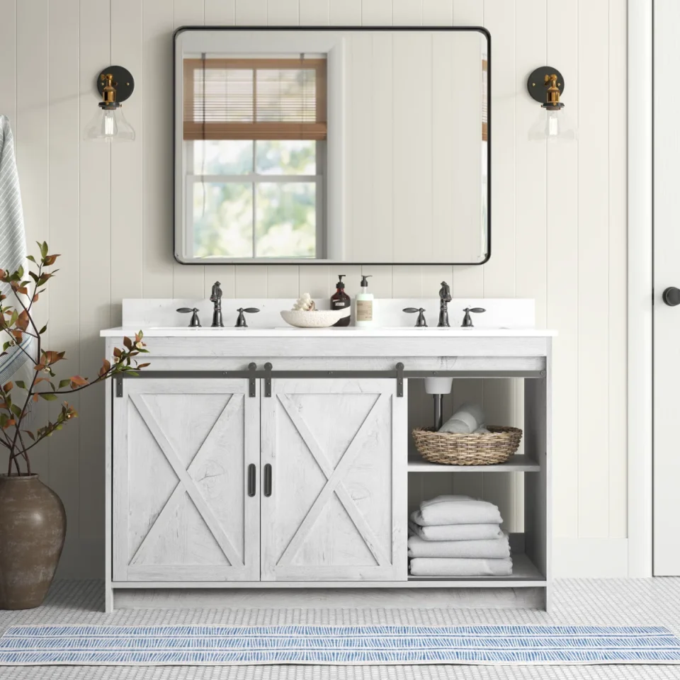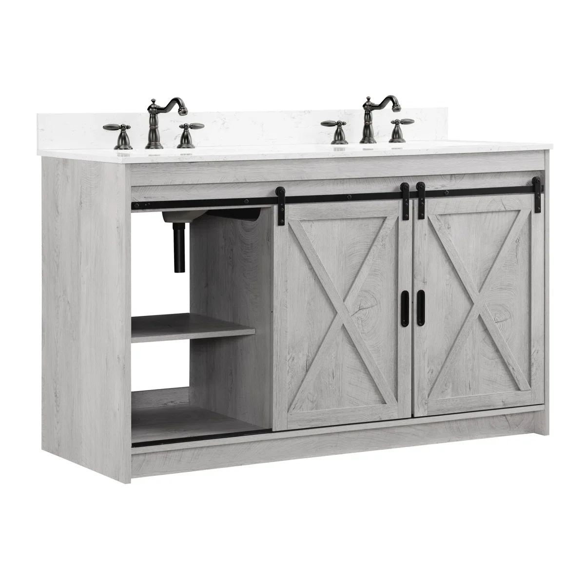 This freestanding double vanity set brings coastal farmhouse charm and extra storage to your main bathroom. An engineered wood frame comes in a weathered finish, and it's built on a plinth-style base for a crisp, classic touch. The white stone countertop measures 54" wide and accommodates two ceramic undermount sinks, and it has a backsplash that helps protect your walls. This vanity includes two barn-style cabinet doors that slide open on a black metal track, revealing space for cleaning supplies and toiletries. Two drawers in the middle let you tuck away makeup and hair products. The faucet is sold separately.