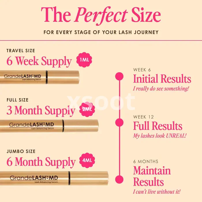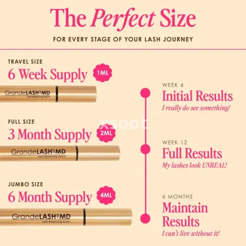 GrandeLASH-MD is available in a three-month supply as well as a six-week starter supply. The six-week starter supply will yield initial results. To see full results, continue to use the formula for a full three months.