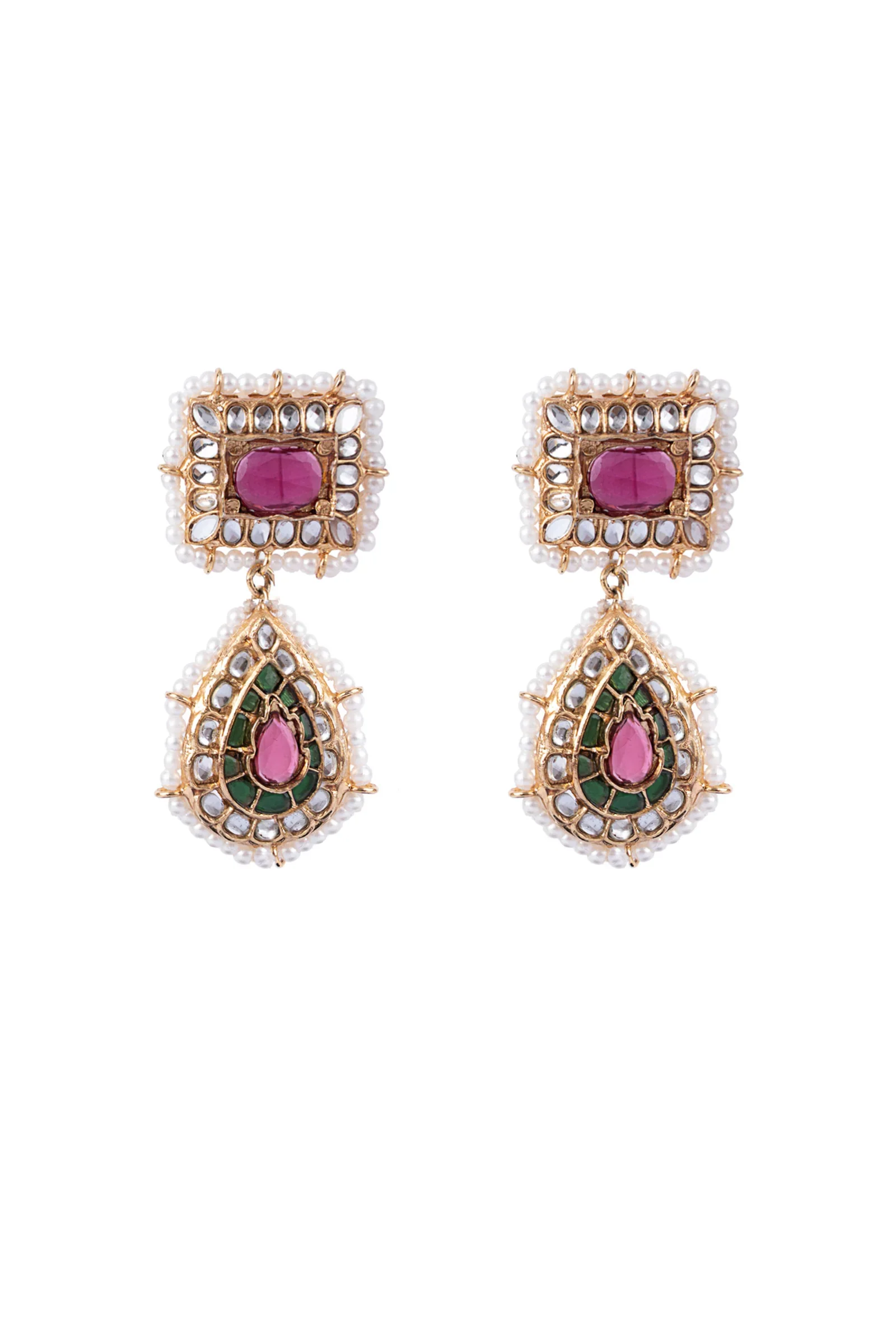 Radiant yet simple, 'Kyra Earrings' offer an effortless head-turning look! The playful handcut glass stones with pink Chatham and green onyx in a kundan setting are perfect to attract all the right attention. The hints of pearls pyroi around the frame blend the style into perfection.