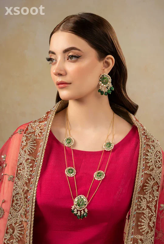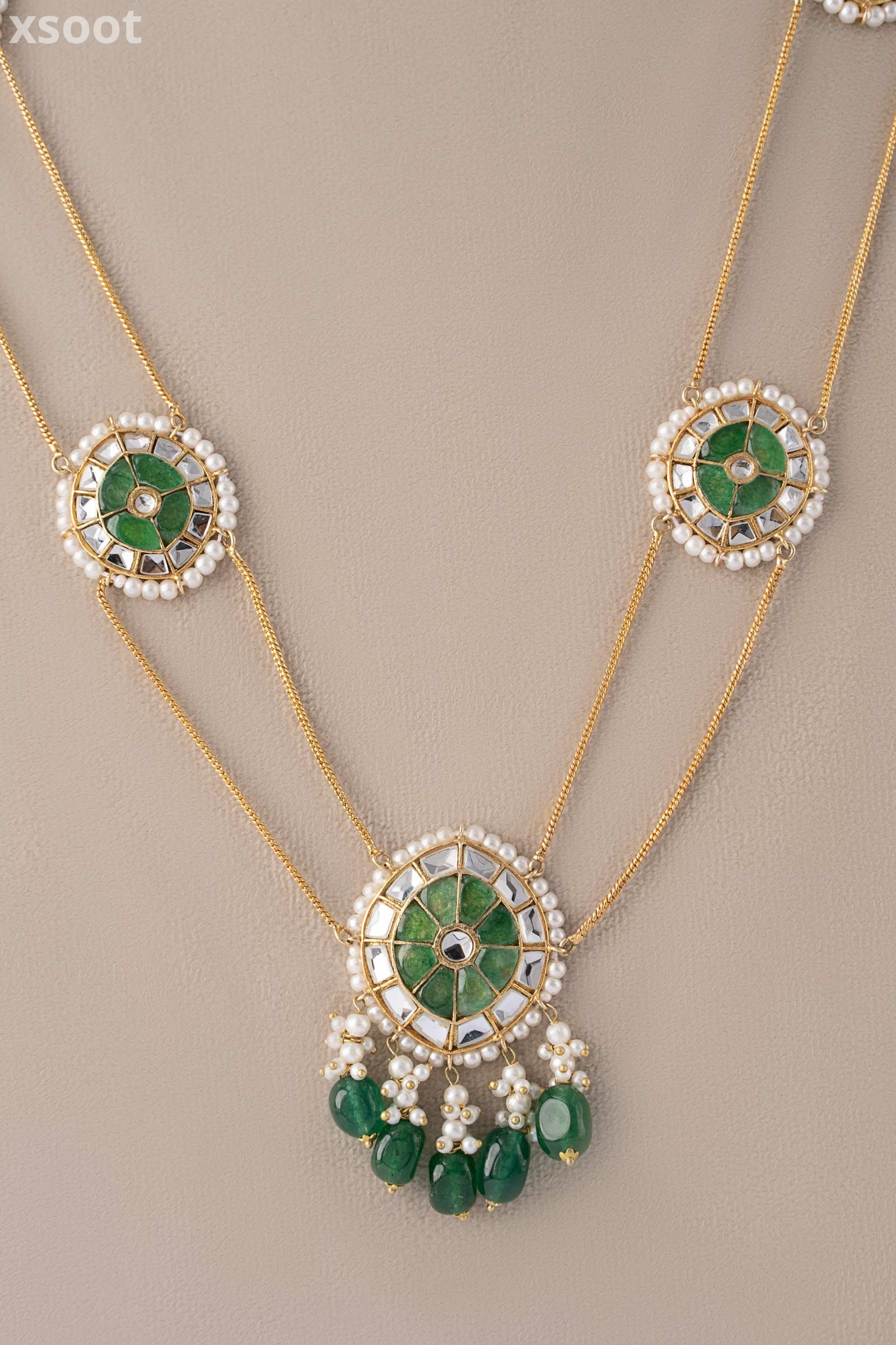 Elevate your festivities with our Kundan Mala, showcasing delicate metal chains encaged with round motifs beautified with handcut white glass, green onyx, and delicate pearls pyroi. for an elevated style, it is finished with green onyx stones in hangings giving it a glamorous yet festive look.