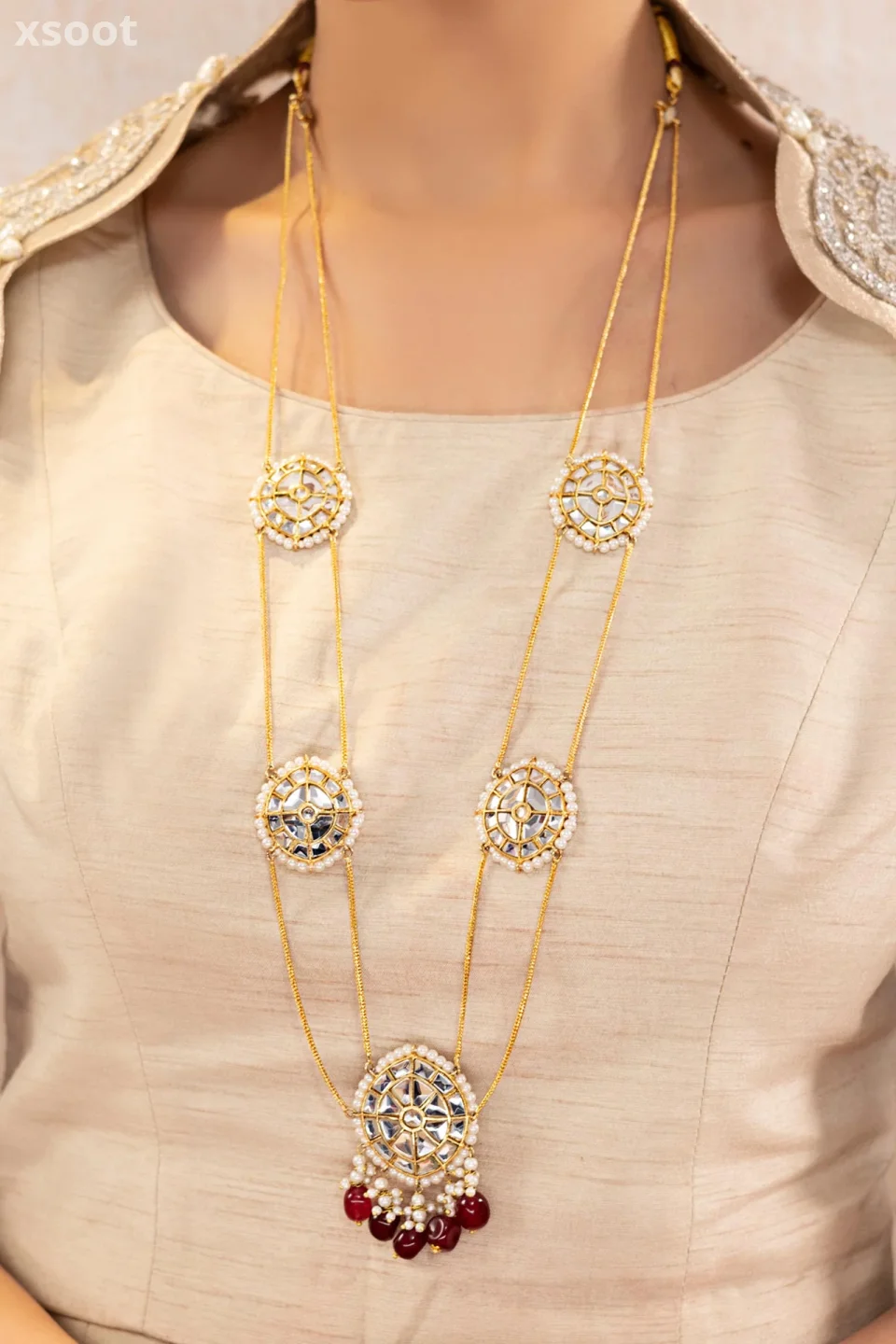 Elevate your festivities with our Kundan Mala, showcasing delicate metal chains encaged with round motifs beautified with handcut white glass stones and delicate pearls pyroi. for an elevated style, it is finished with red onyx stones in hangings giving it a glamorous yet festive look.