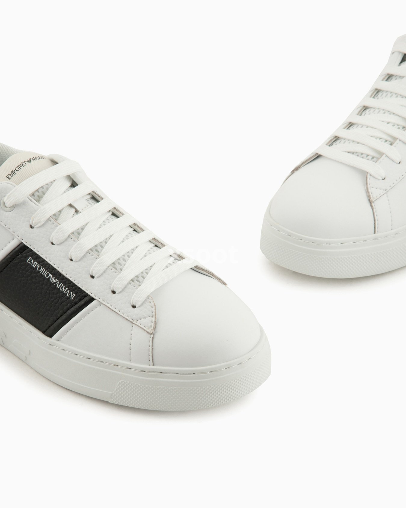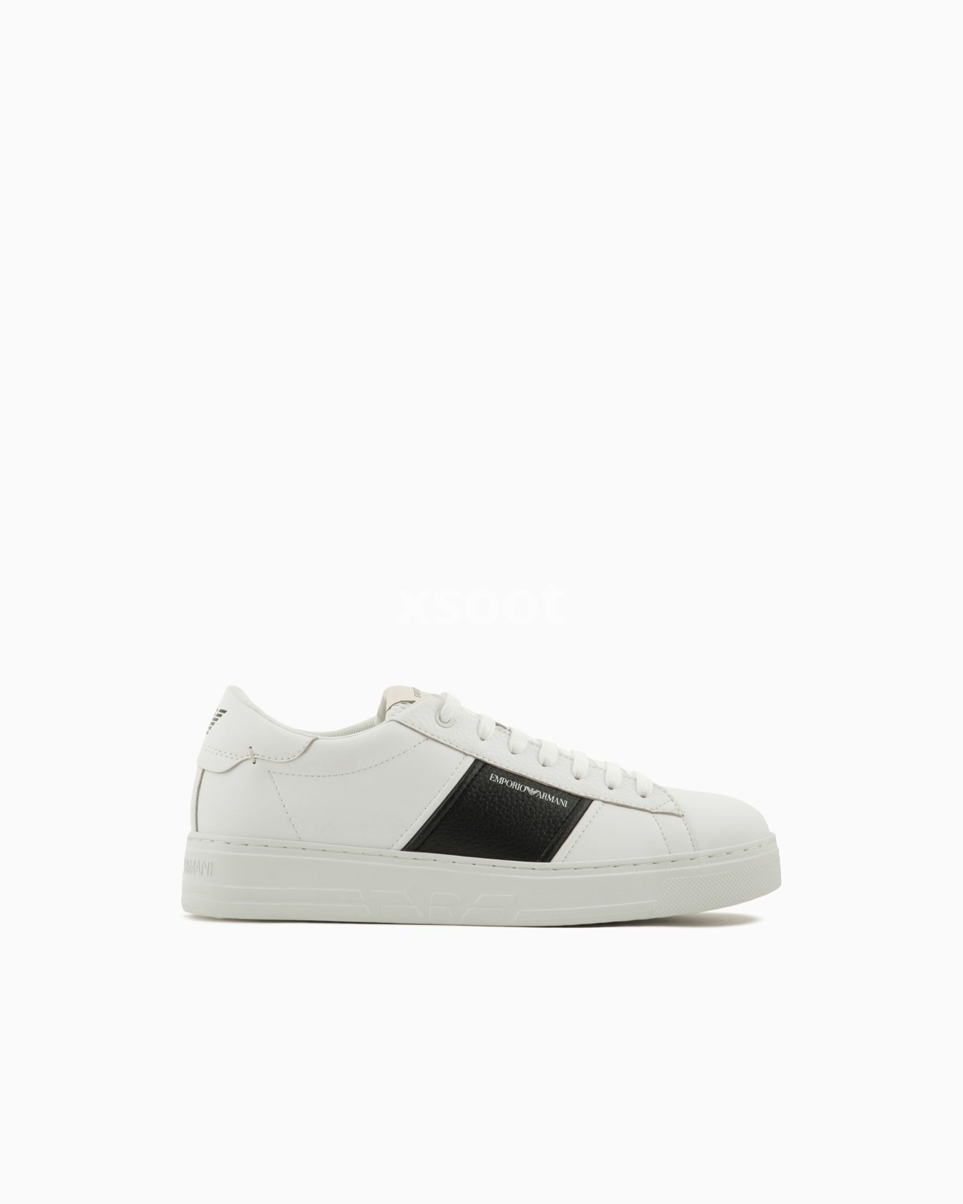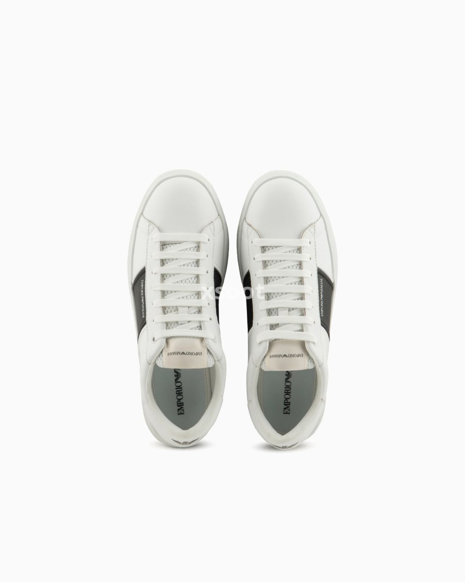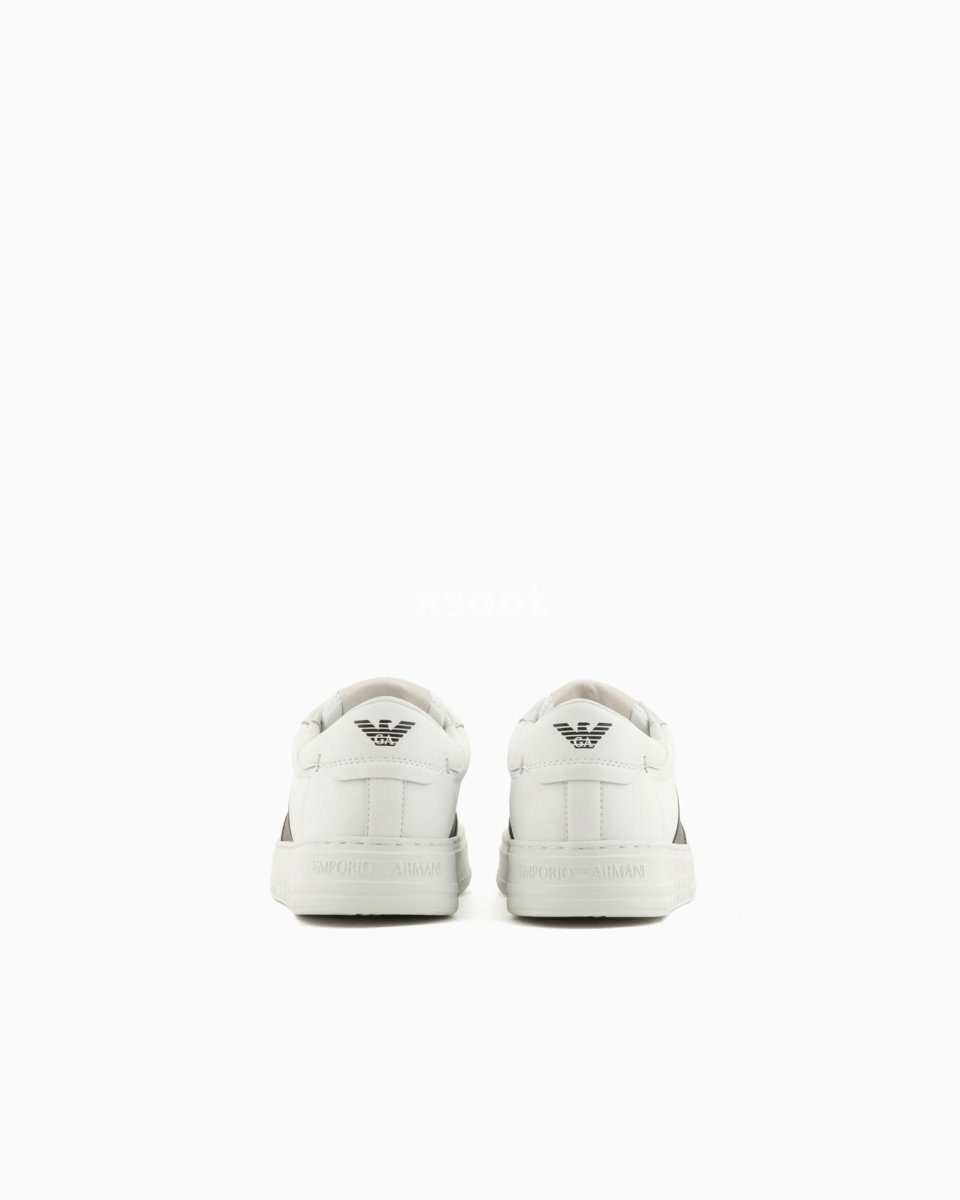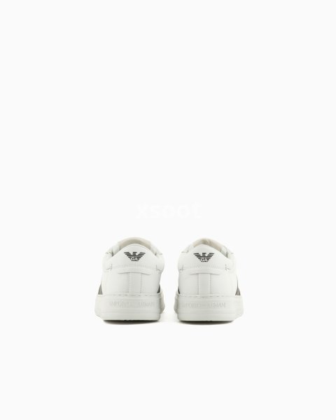 Calfskin sneakers with contrasting side logo detail. The front of the tongue and back tab have a screen-printed Emporio Armani logo and eagle motif. Clean-lines and comfort define these sneakers with their essential design that echoes 90s-style basketball footwear.