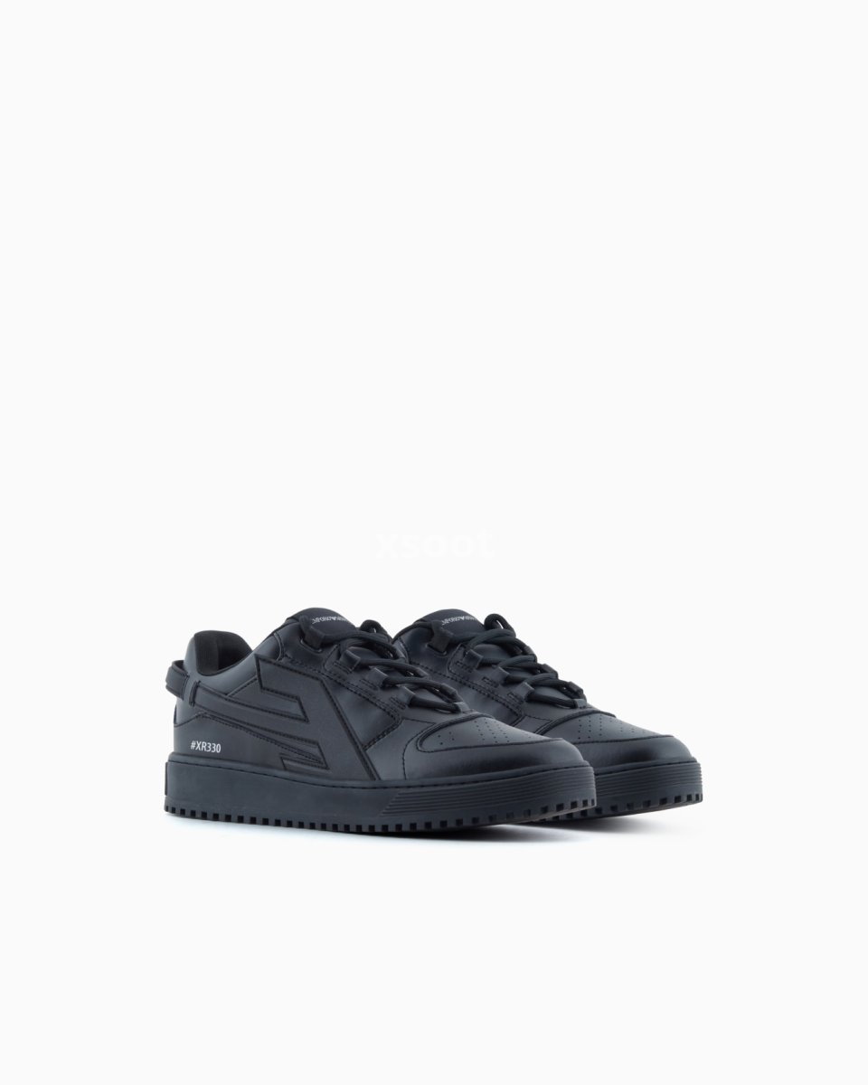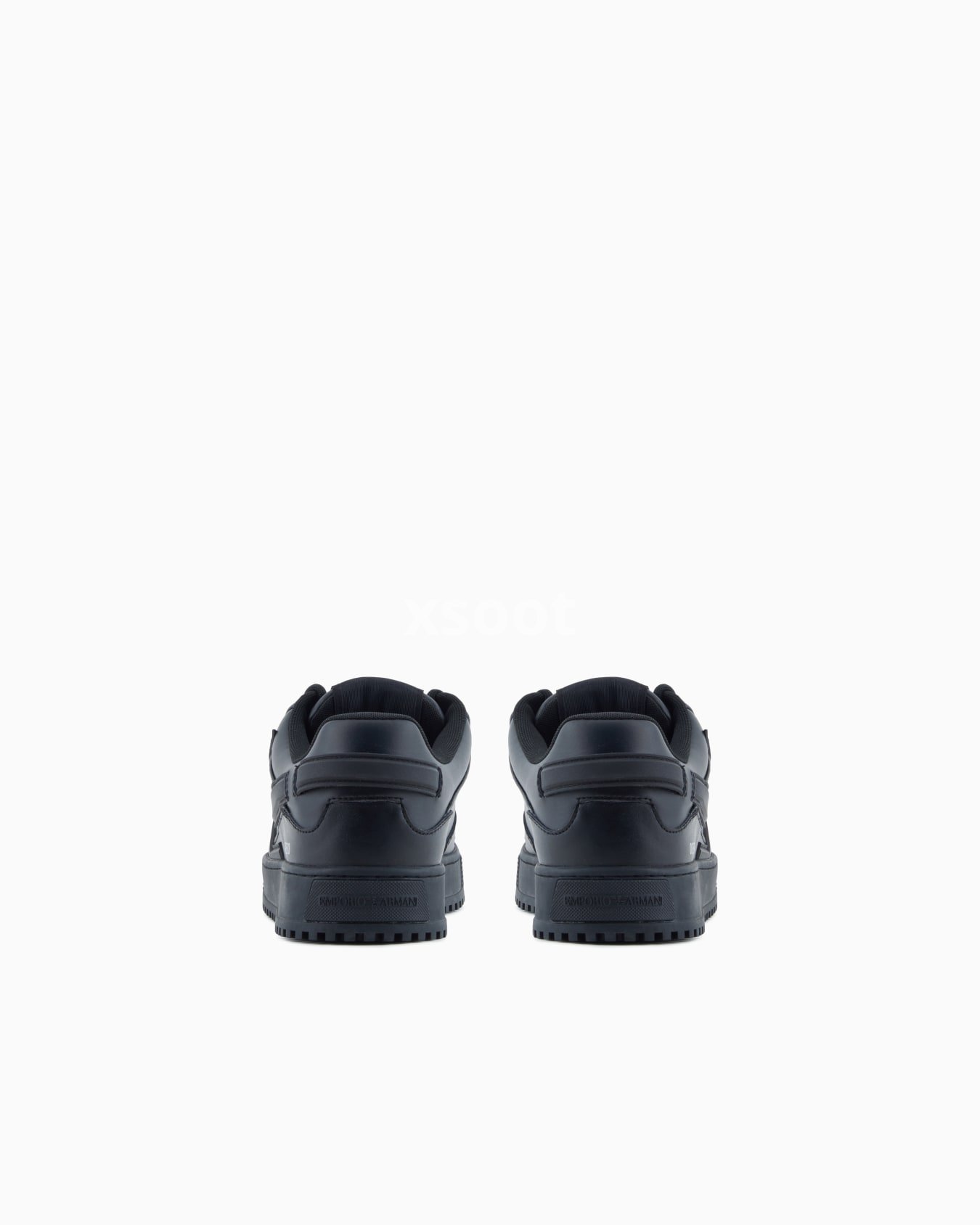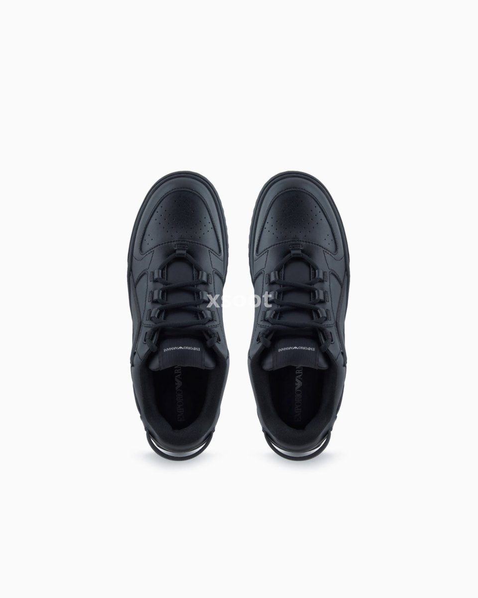 Leather sneakers with oversized EA side patch; equipped with a notched tread and double fastening with laces and a Velcro strap. Emporio Armani interprets the skating world of the late 1990s, offering uppers with padding on the collar and ankle, without ever losing sight of the brand’s signature clean, minimalist lines.