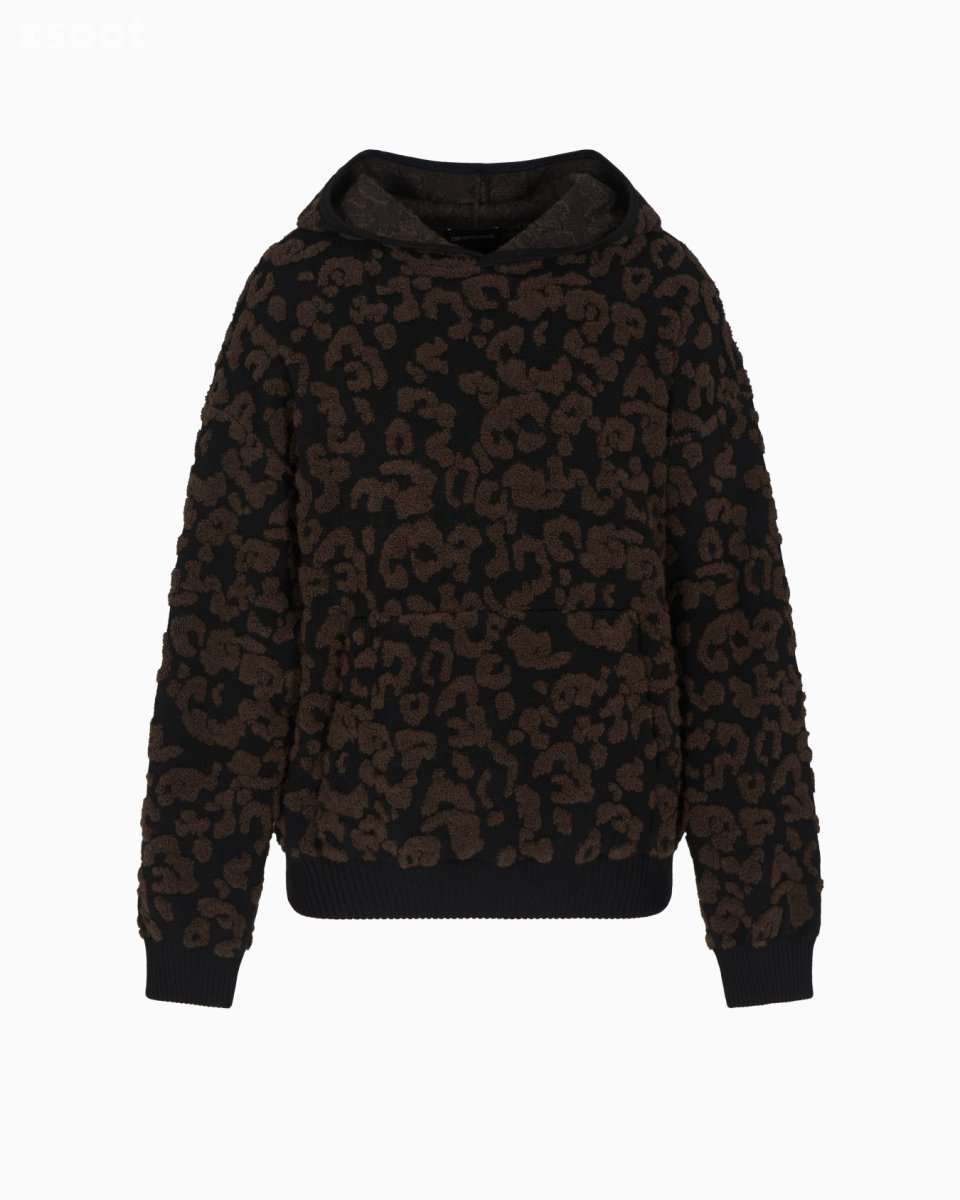 Hooded jumper in virgin wool, made unique by an original embossed embroidery-stitched jacquard depicting a refined leopard pattern with a soft finish.