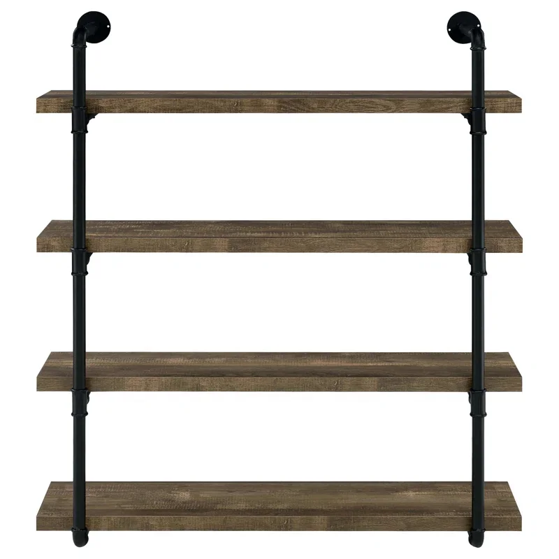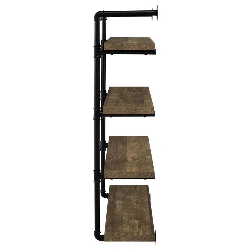 This tiered, wall-mounted 4-shelf unit exhibits a tantalizing industrial flair with its black metal frame inspired by pipes for an industrial look, with engineered wood shelves in a warm brown finish. It lets you arrange books, family photos, plants, and even the odd decorative knick-knack with a personality as strong as black coffee. Plus, with wood scoring and rub through distressing, it adds a touch of rustic charm to any space. It measures a little over 3' wide.