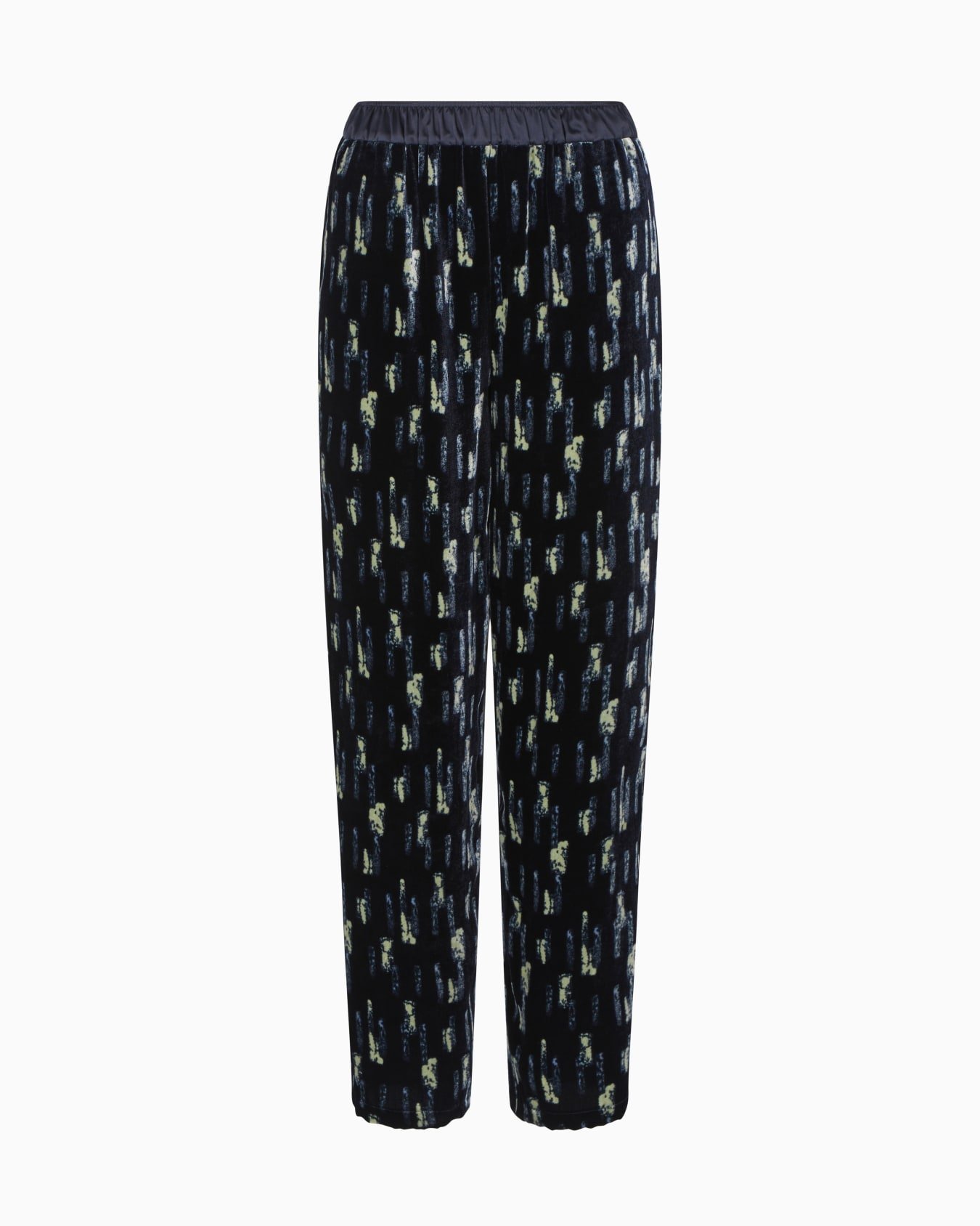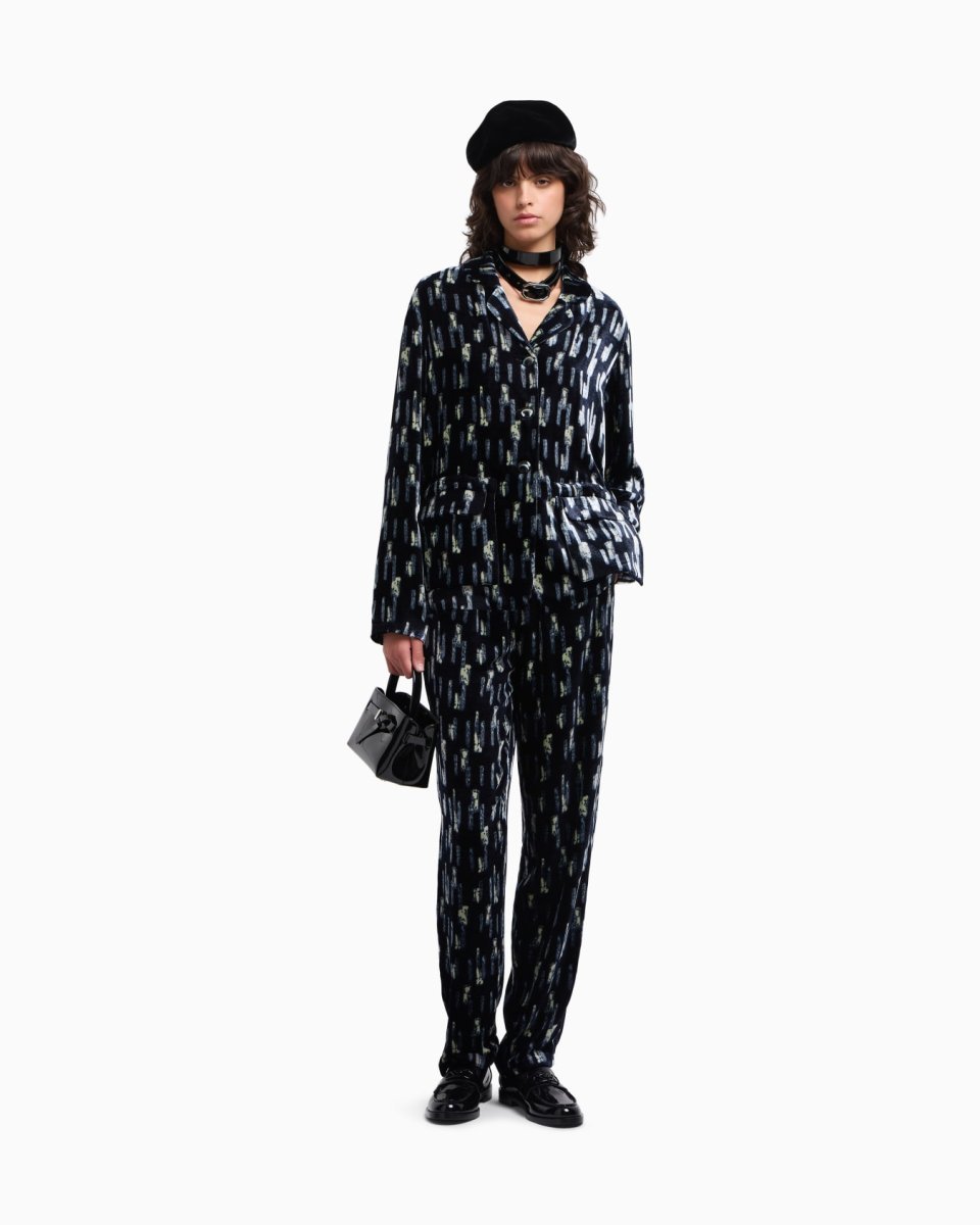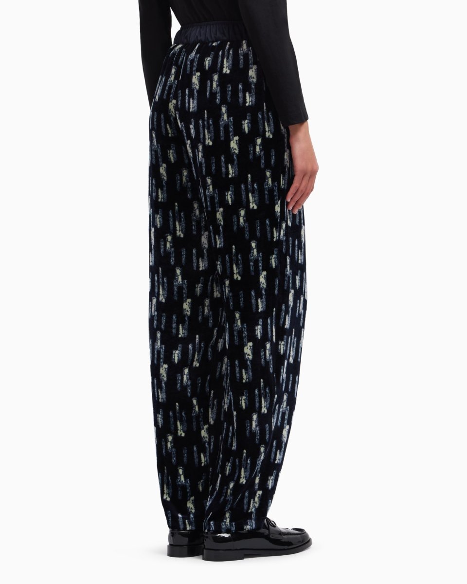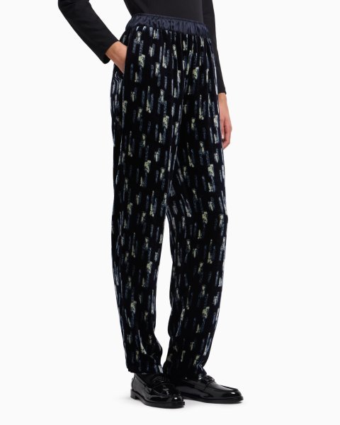 Trousers with a elasticated waist in satin, made of velvet with an all-over print. A key piece distinguished by its sophistication and elegance.