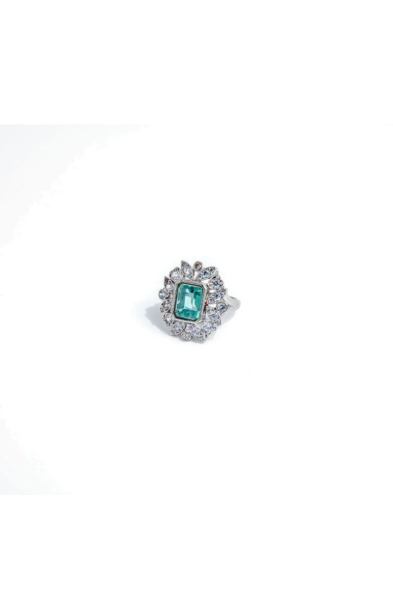 Handset stones with a four-sided view of sparkling round zircons topped off with a teal blue glass cut stone to add elegance and a refined taste to your modern look. Rhodium plated with Alloy metal