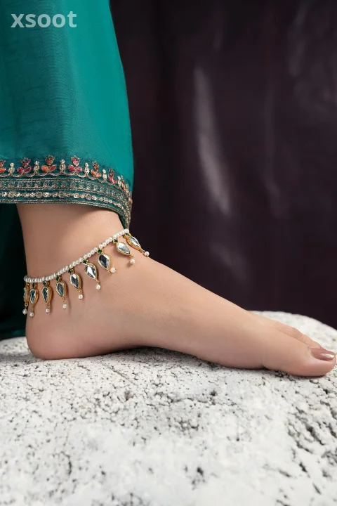 Add classic elegance to your look with this anklet - showcasing a delicate string of pearls eloped in a stunning setting of handcut glass and green onyx stones. Embodying the essence of celebration with richness it is finished with pearl pyroi, making it a perfect choice for a regal look.