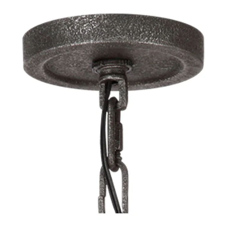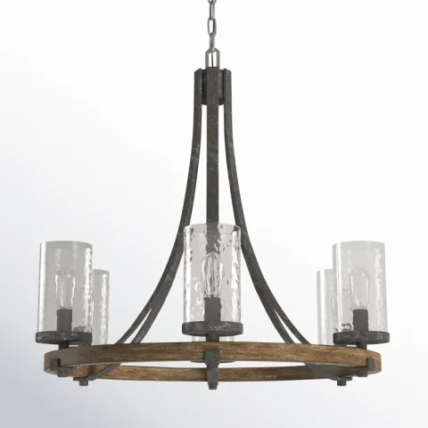 This 6-light chandelier features a classic wagon wheel silhouette, consisting of an oak-toned ring and metal sloped supports for a vintage-inspired vibe. The fixture is crafted from steel with a distressed finish that brings a well-loved look we love your dining room or living area. Six bulbs rest behind clear hammered glass shades that reflect the dimmable glow. This chandelier hangs with the help of a height-adjustable chain and a canopy that's compatible with sloped ceilings. It's also damp-rated for use in high-moisture environments.