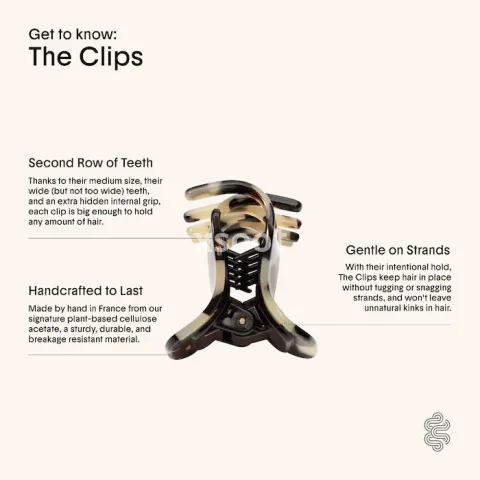 What Else You Need to Know: These versatile hair clips feature widely spaced teeth and an extra internal grip. Each one is big enough to hold plenty of hair and small enough to keep it all in place without leaving any indentations or unnatural kinks. They're handmade in France from our signature plant-based cellulose acetate.