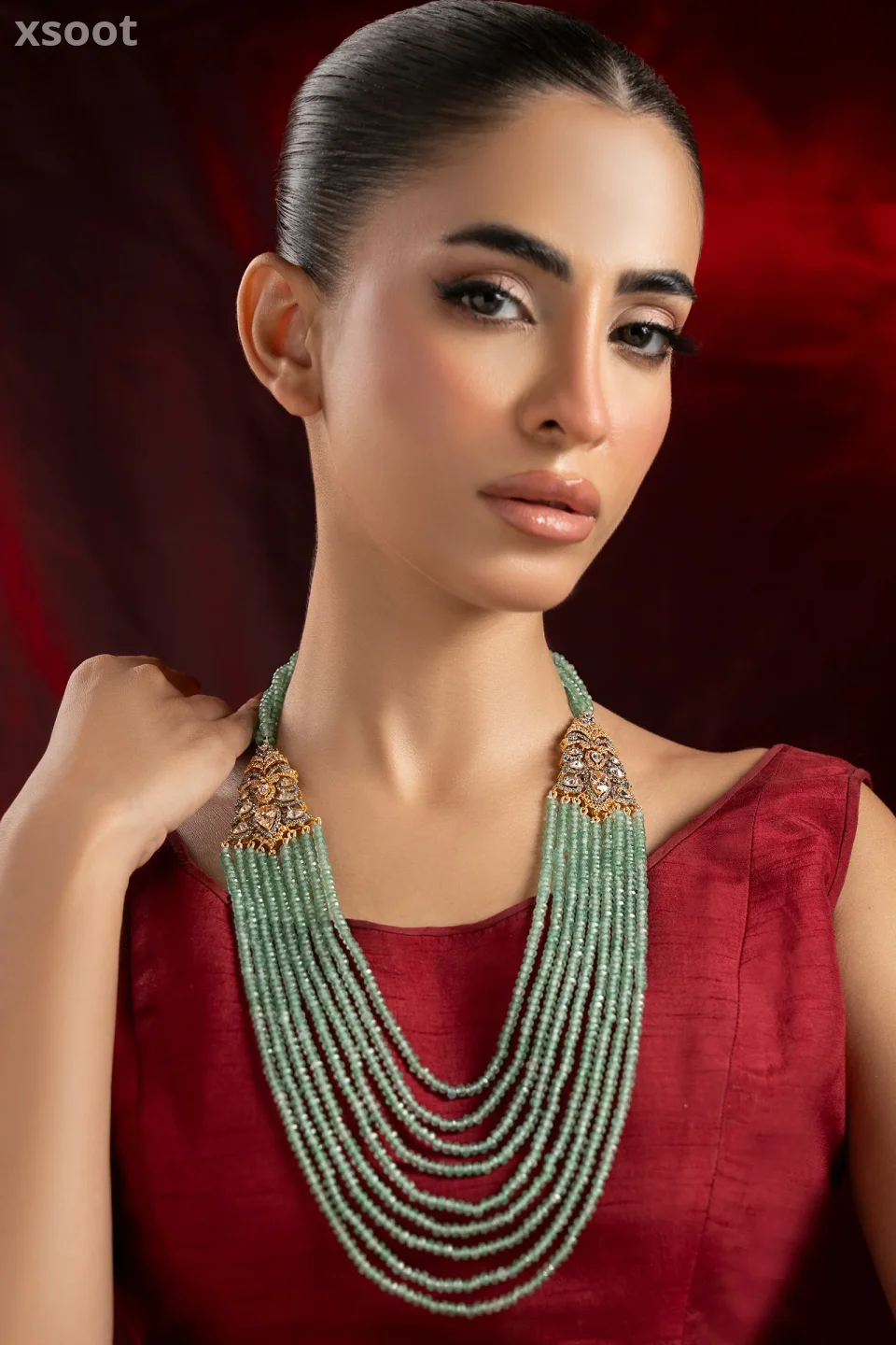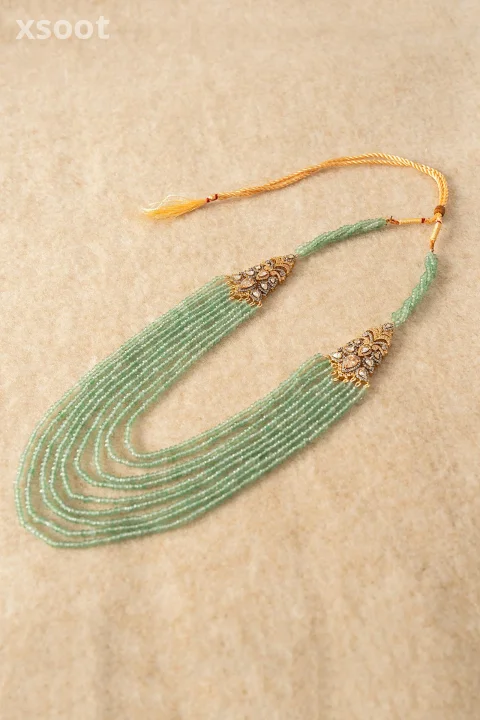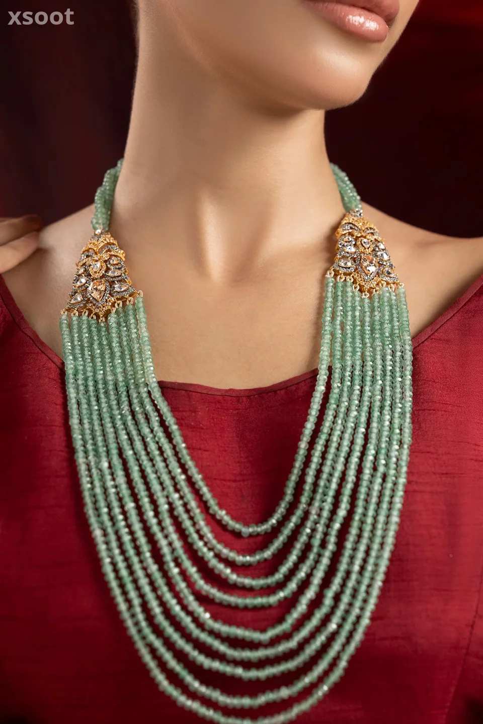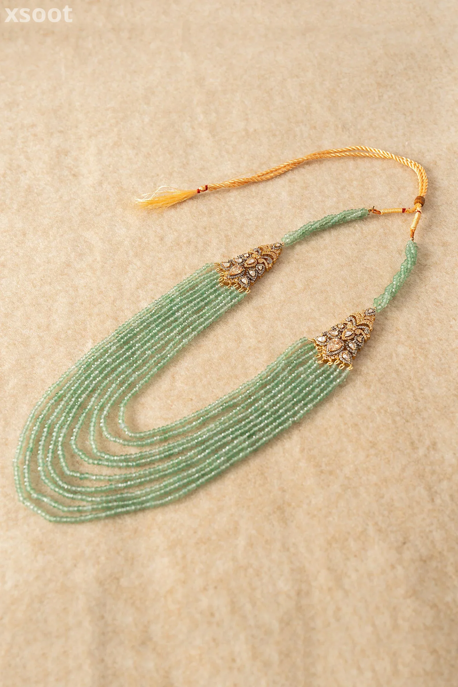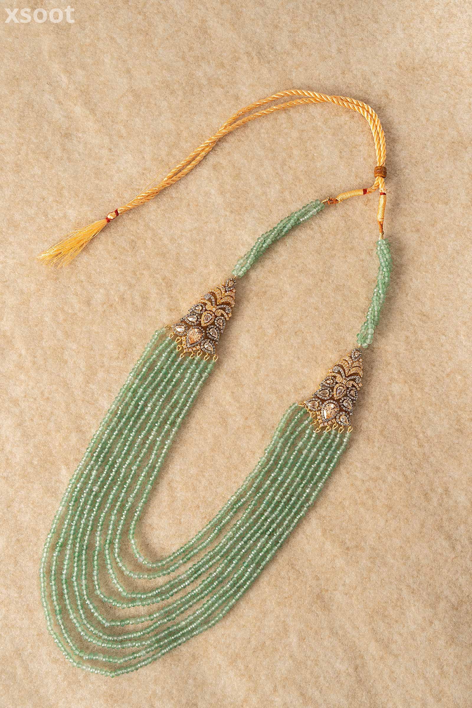 This exquisite mala, which is made of sparkling white and champagne zircons and exquisitely combined with calming mint green onyx, exudes festive charm. A flawless balance of glitz and understated elegance that will give your traditional gatherings a timeless elegance.